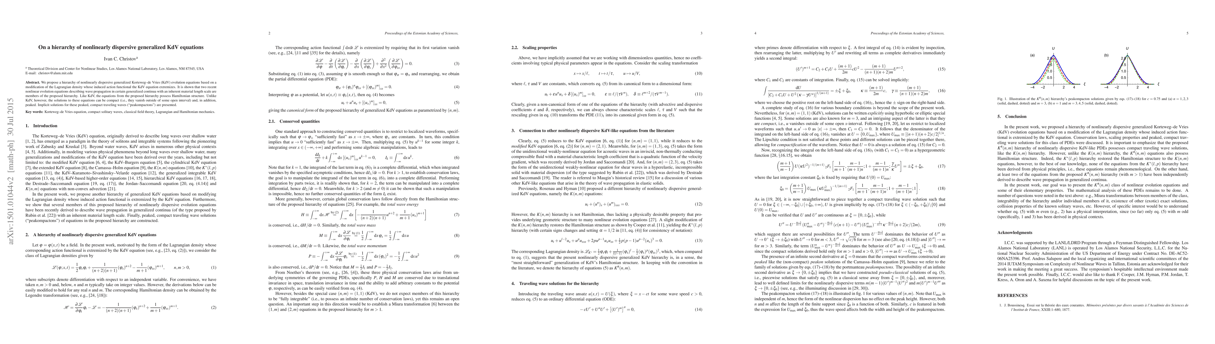 We propose a hierarchy of nonlinearly dispersive generalized Korteweg--de Vries (KdV) evolution equations based on a modification of the Lagrangian density whose induced action functional the KdV equation extremizes. It is shown that two recent nonlinear evolution equations describing wave propagation in certain generalized continua with an inherent material length scale are members of the proposed hierarchy. Like KdV, the equations from the proposed hierarchy possess Hamiltonian structure. Unlike KdV, however, the solutions to these equations can be compact (i.e., they vanish outside of some open interval) and, in addition, peaked. Implicit solutions for these peaked, compact traveling waves ("peakompactons") are presented.