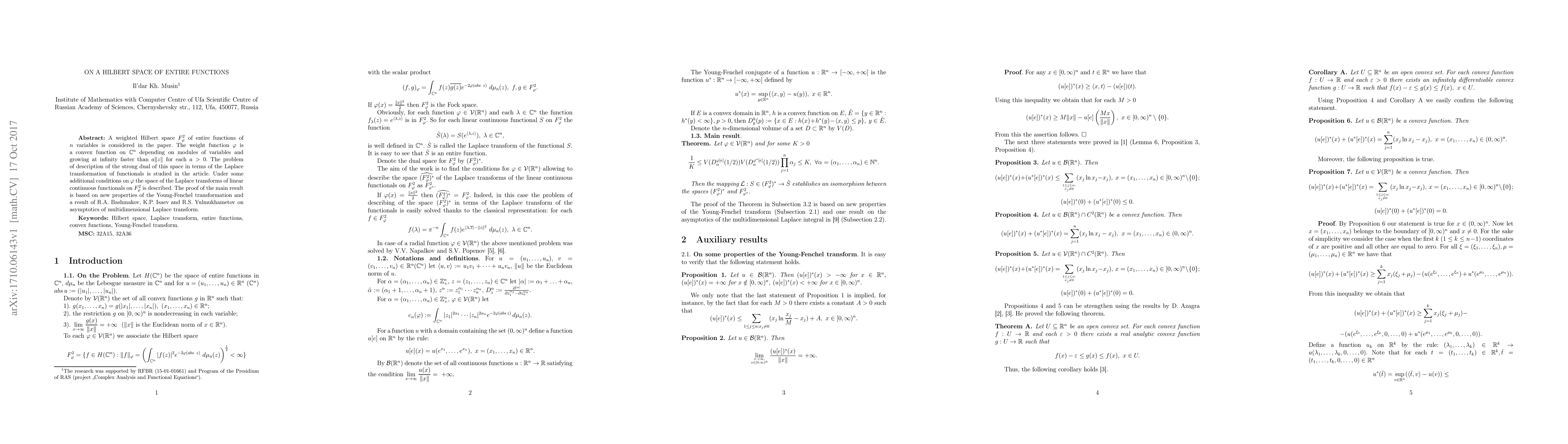 This research paper explores a weighted Hilbert space of entire functions and describes its strong dual in terms of Laplace transforms under certain conditions on the weight function. It uses new properties of the Young-Fenchel transformation and results from R.A. Bashmakov, K.P. Isaev, and R.S. Yulmukhametov to establish this connection.