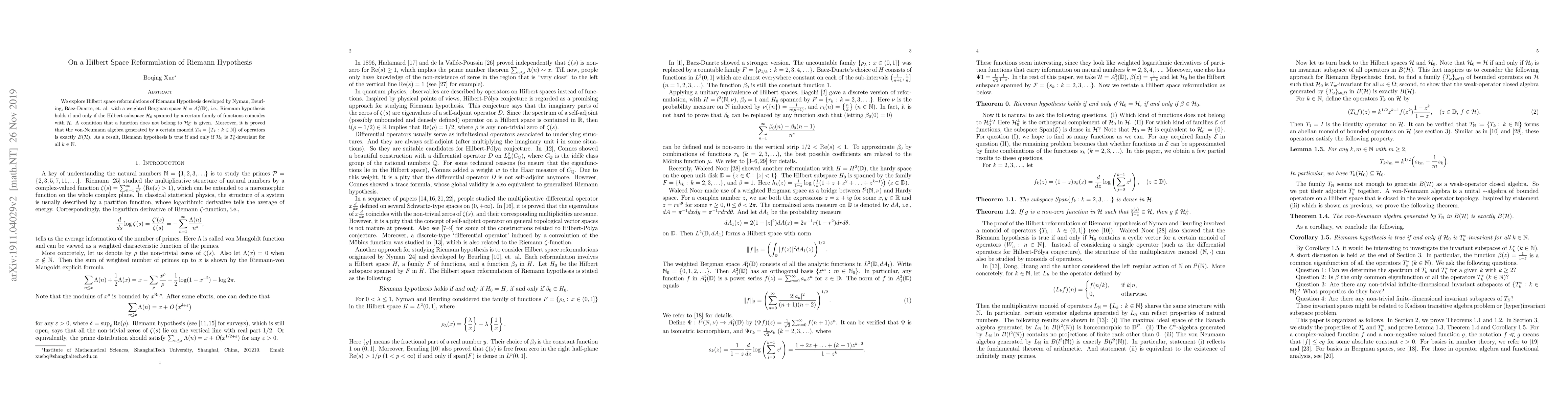 We explore Hilbert space reformulations of Riemann Hypothesis developed by Nyman, Beurling, B\'{a}ez-Duarte, et. al. with a weighted Bergman space $\mathcal{H}=A_1^2(\mathbb{D})$, i.e., Riemann hypothesis holds if and only if the Hilbert subspace $\mathcal{H}_0$ spanned by a certain family of functions coincides with $\mathcal{H}$. A condition that a function does not belong to $\mathcal{H}_0^\bot$ is given. Moreover, it is proved that the von-Neumann algebra generated by a certain monoid $T_\mathbb{N}=\{T_k:\, k\in \mathbb{N}\}$ of operators is exactly $B(\mathcal{H})$. As a result, Riemann hypothesis is true if and only if $\mathcal{H}_0$ is $T_k^\ast$-invariant for all $k\in \mathbb{N}$.