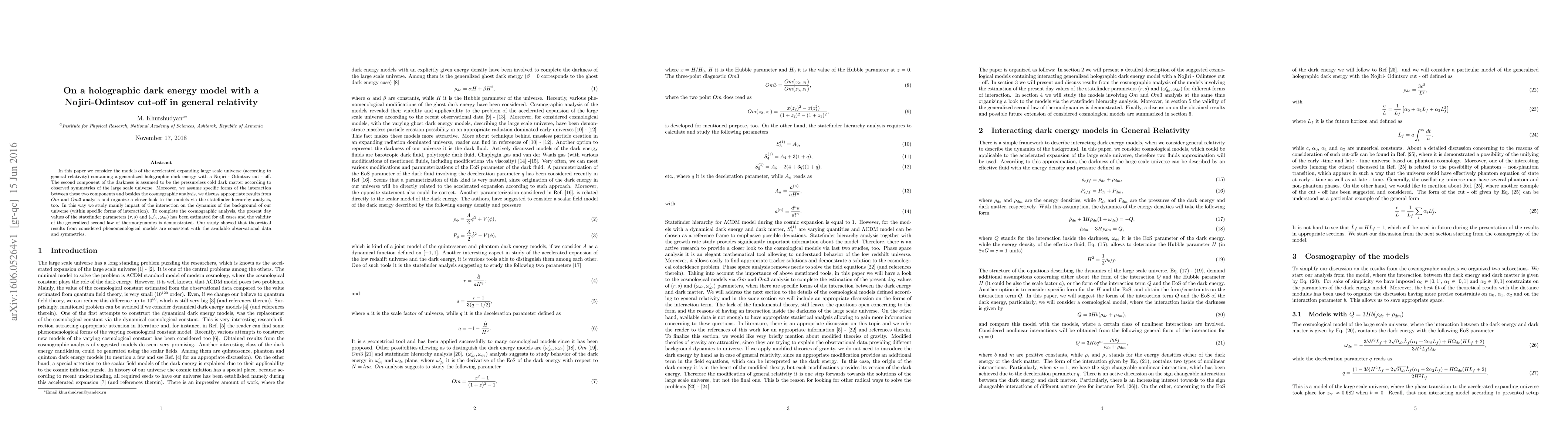 This paper explores a holographic dark energy model with a Nojiri-Odintsov cut-off in general relativity, incorporating pressureless cold dark matter and specific interaction forms. It analyzes the model's impact on the universe's background dynamics using cosmographic, $Om$ and $Om3$ analyses, and statefinder hierarchy, concluding consistency with observational data.