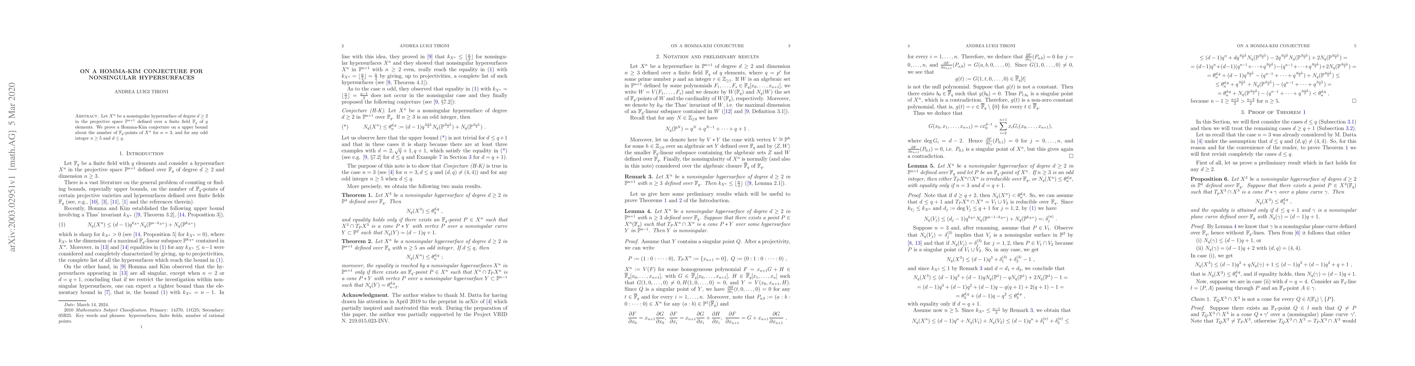 This paper proves the Homma-Kim conjecture providing an upper bound for the number of $\mathbb{F}_q$-points on nonsingular hypersurfaces $X^n$ of degree $d\geq 2$ in $\mathbb{P}^{n+1}$ for $n=3$ and for any odd $n\geq 5$ with $d\leq q$. The results are specific to hypersurfaces defined over finite fields.
