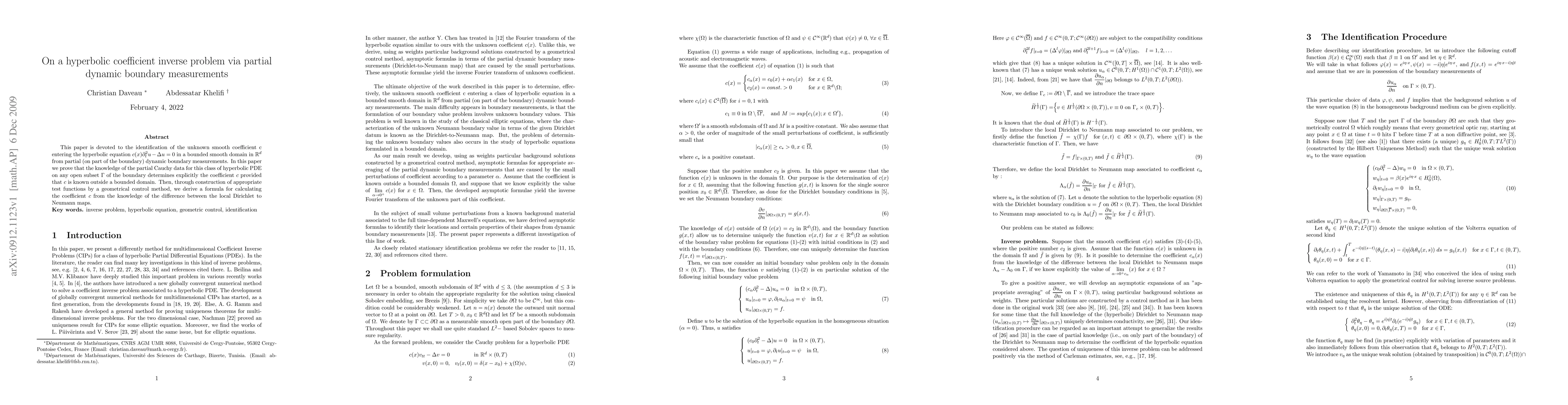 This paper identifies an unknown smooth coefficient in a hyperbolic PDE using partial dynamic boundary measurements, proving that partial Cauchy data on a boundary subset determines the coefficient, provided it is known elsewhere, and derives a formula for calculating the coefficient from the difference between local Dirichlet to Neumann maps.