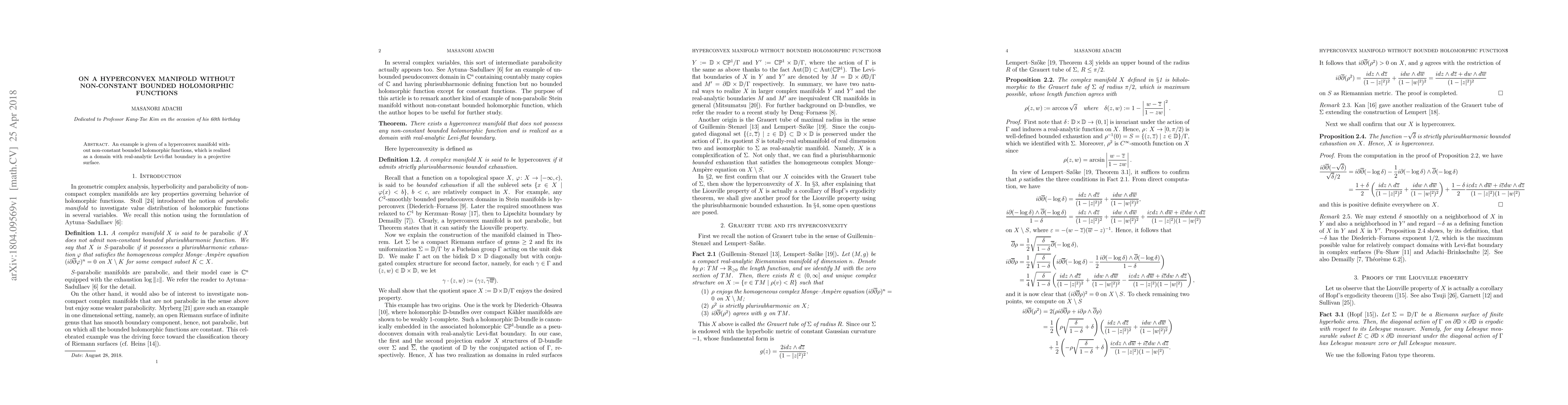 Summary: This paper presents an example of a hyperconvex manifold lacking non-constant bounded holomorphic functions, constructed as a domain with real-analytic Levi-flat boundary in a projective surface. The study highlights the unique geometric properties of such manifolds.