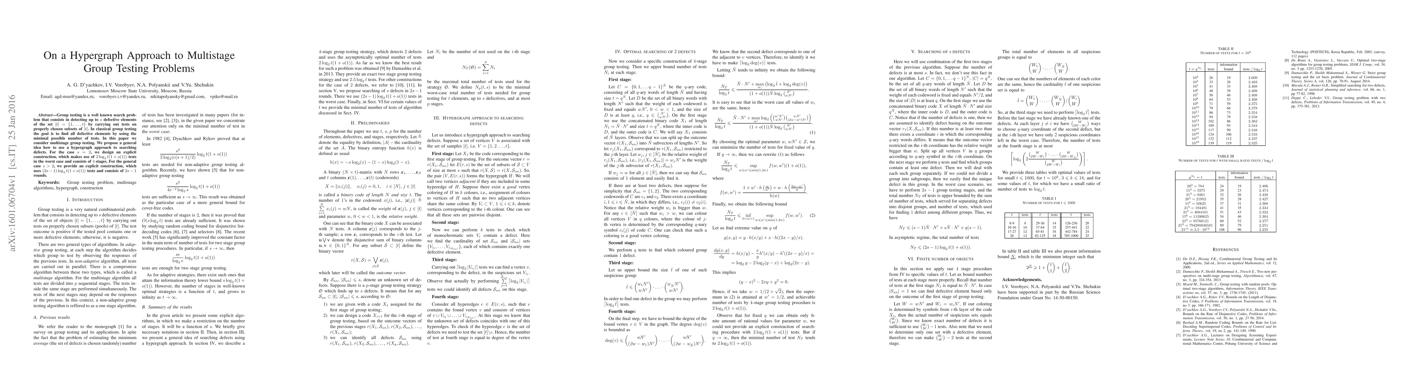 This paper proposes a hypergraph approach for multistage group testing to detect defective elements efficiently. It provides an explicit construction for $s=2$ requiring $2\log_2t(1+o(1))$ tests over $4$ stages and a general construction for $s>2$ using $(2s-1)\log_2t(1+o(1))$ tests over $2s-1$ rounds.