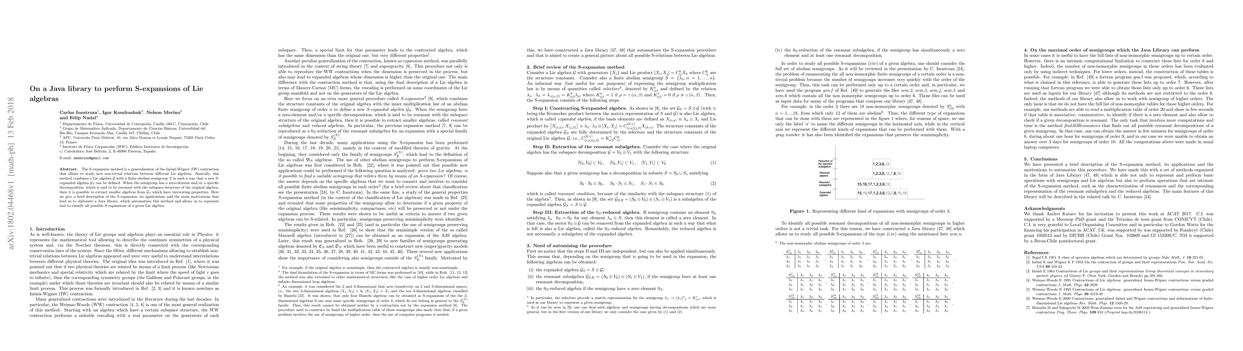 The S-expansion method is a generalization of the In\"{o}n\"{u}-Wigner (IW) contraction that allows to study new non-trivial relations between different Lie algebras. Basically, this method combines a Lie algebra $\mathcal{G}$ with a finite abelian semigroup $S$ in such a way that a new S-expanded algebra $\mathcal{G}_{S}$ can be defined. When the semigroup has a zero-element and/or a specific decomposition, which is said to be resonant with the subspace structure of the original algebra, then it is possible to extract smaller algebras from $\mathcal{G}_{S}$ which have interesting properties. Here we give a brief description of the S-expansion, its applications and the main motivations that lead us to elaborate a Java library, which automatizes this method and allows us to represent and to classify all possible S-expansions of a given Lie algebra.