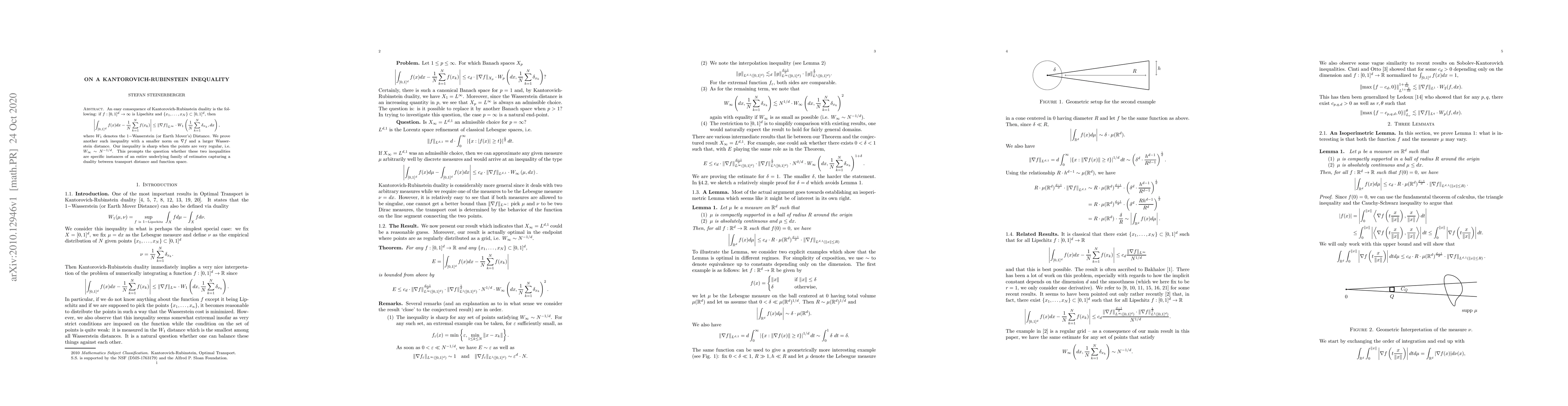 This paper establishes a refined Kantorovich-Rubinstein inequality, showing a tighter bound between the integral of a Lipschitz function over a unit cube and its average over sampled points, using a smaller norm on the gradient and a larger Wasserstein distance. The authors explore the sharpness of their inequality and suggest the existence of a broader family of inequalities reflecting a duality between transport distance and function space norms.