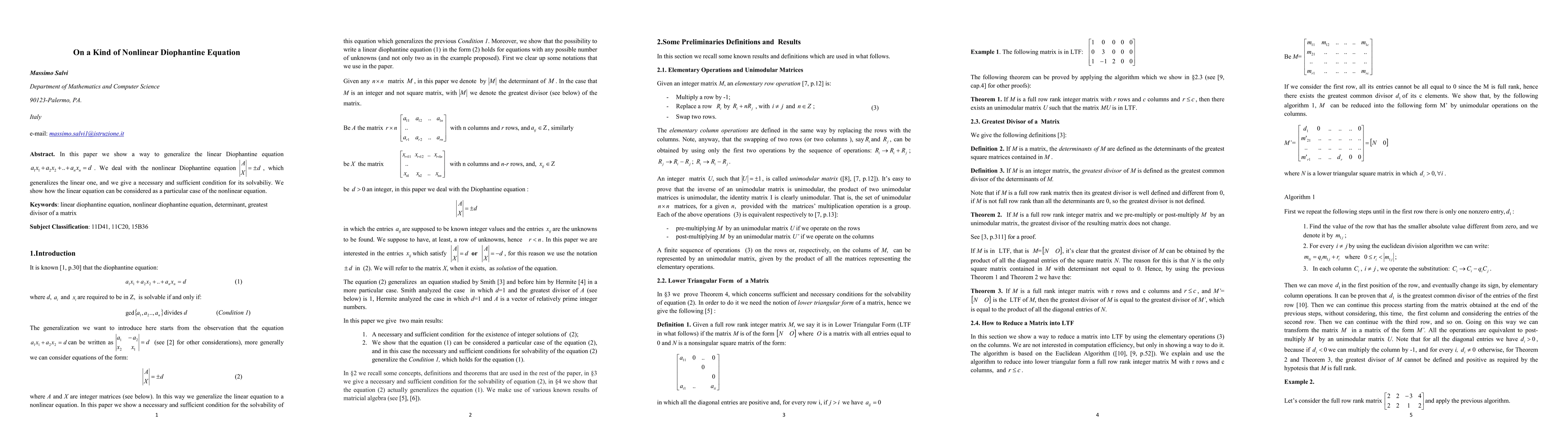 In this paper we show a way to generalize the linear Diophantine equation a1x1+a2x2+...+anxn=d . We deal with the nonlinear Diophantine equation det|A X|=+-d , which generalizes the linear one, and we give a necessary and sufficient condition for its solvabiliy. We show how the linear equation can be considered as a particular case of the nonlinear equation.