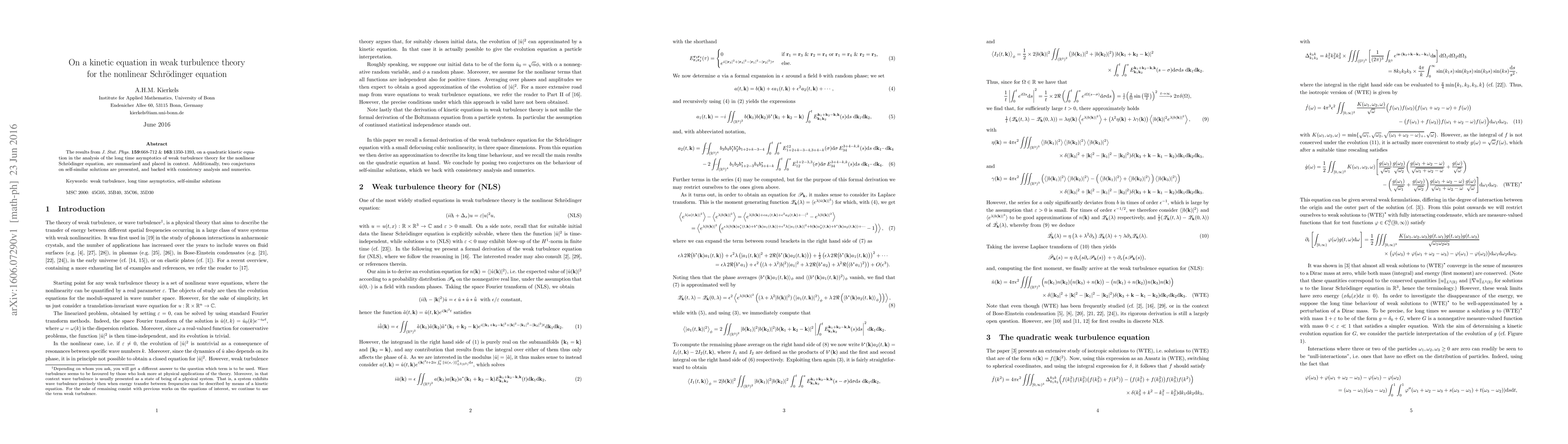 The results from J. Stat. Phys. 159:668-712 & 163:1350-1393, on a quadratic kinetic equation in the analysis of the long time asymptotics of weak turbulence theory for the nonlinear Schr\"odinger equation, are summarized and placed in context. Additionally, two conjectures on self-similar solutions are presented, and backed with consistency analysis and numerics.