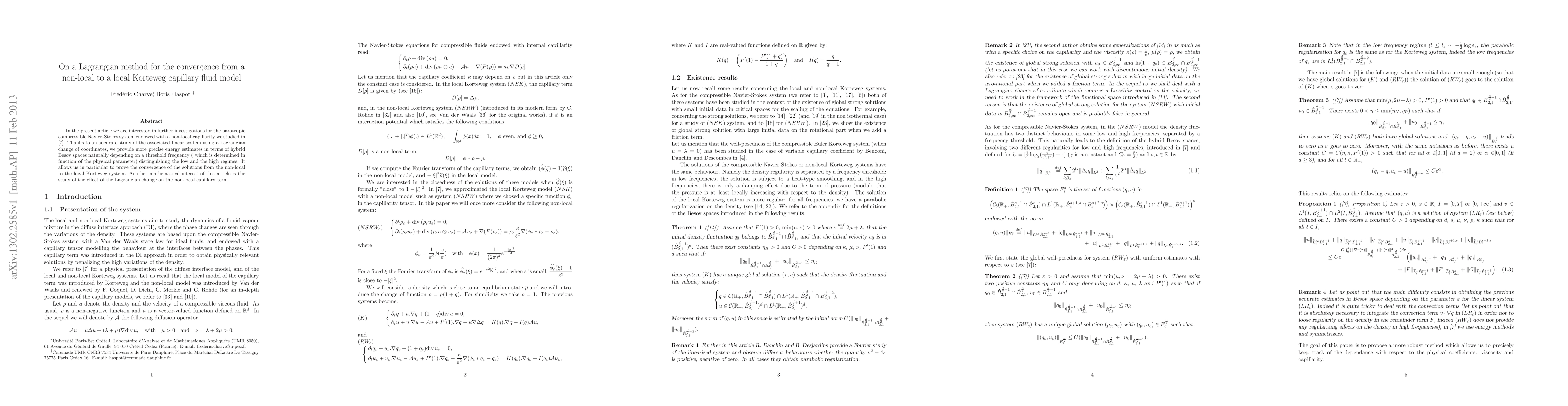 This paper develops a Lagrangian method to study the convergence of solutions from a non-local to a local Korteweg capillary fluid model, providing precise energy estimates for two regimes.