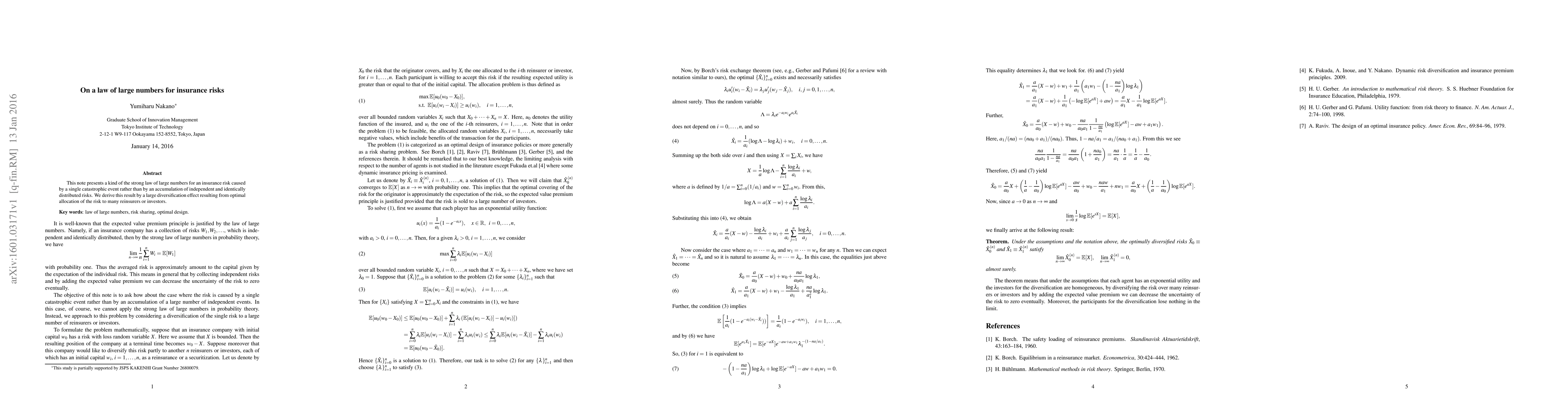 A new law of large numbers for insurance risks is proposed, which applies to a single catastrophic event rather than independent risks. It's achieved through optimal risk allocation to many reinsurers or investors.