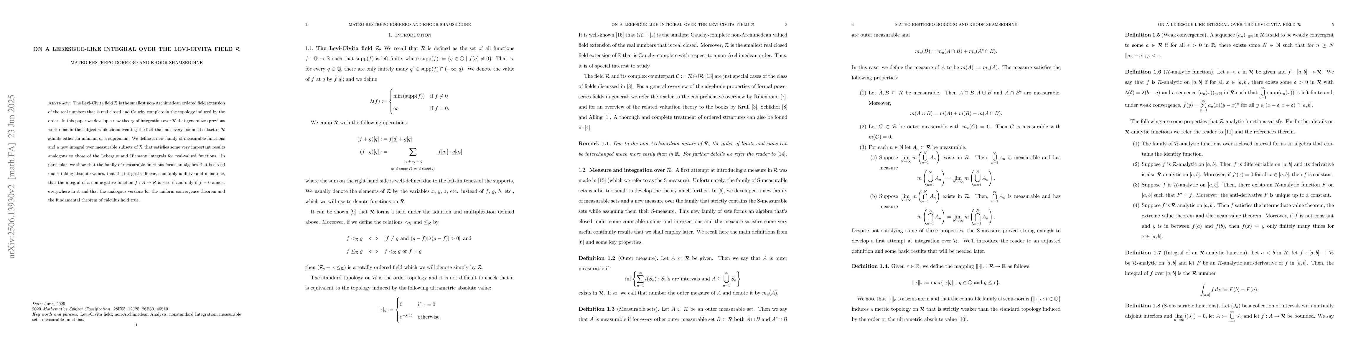 The Levi-Civita field $\mathcal{R}$ is the smallest non-Archimedean ordered field extension of the real numbers that is real closed and Cauchy complete in the topology induced by the order. In this paper we develop a new theory of integration over $\mathcal{R}$ that generalizes previous work done in the subject while circumventing the fact that not every bounded subset of $\mathcal{R}$ admits either an infimum or a supremum. We define a new family of measurable functions and a new integral over measurable subsets of $\mathcal{R}$ that satisfies some very important results analogous to those of the Lebesgue and Riemann integrals for real-valued functions. In particular, we show that the family of measurable functions forms an algebra that is closed under taking absolute values, that the integral is linear, countably additive and monotone, that the integral of a non-negative function $f:A\to\mathcal{R}$ is zero if and only if $f=0$ almost everywhere in $A$ and that the analogous versions for the uniform convergence theorem and the fundamental theorem of calculus hold true.