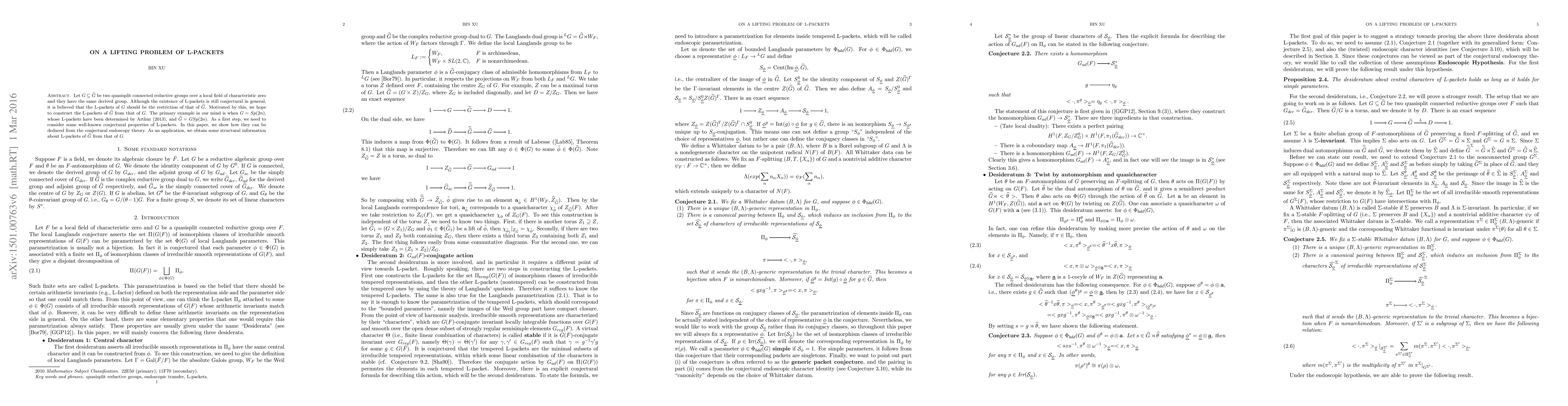 This paper investigates the relationship between L-packets of connected reductive groups over local fields, focusing on a lifting problem from $G$ to $ ilde{G}$, with specific examples for $Sp(2n)$.