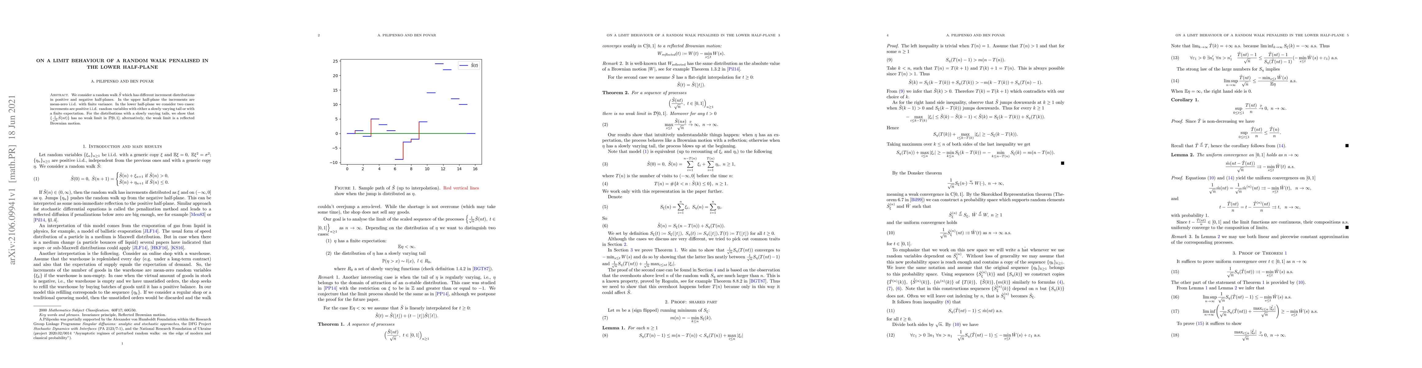 We consider a random walk $\tilde S$ which has different increment distributions in positive and negative half-planes. In the upper half-plane the increments are mean-zero i.i.d. with finite variance. In the lower half-plane we consider two cases: increments are positive i.i.d. random variables with either a slowly varying tail or with a finite expectation. For the distributions with a slowly varying tails, we show that $\{\frac{1}{\sqrt n} \tilde S(nt)\}$ has no weak limit in $\De$; alternatively, the weak limit is a reflected Brownian motion.