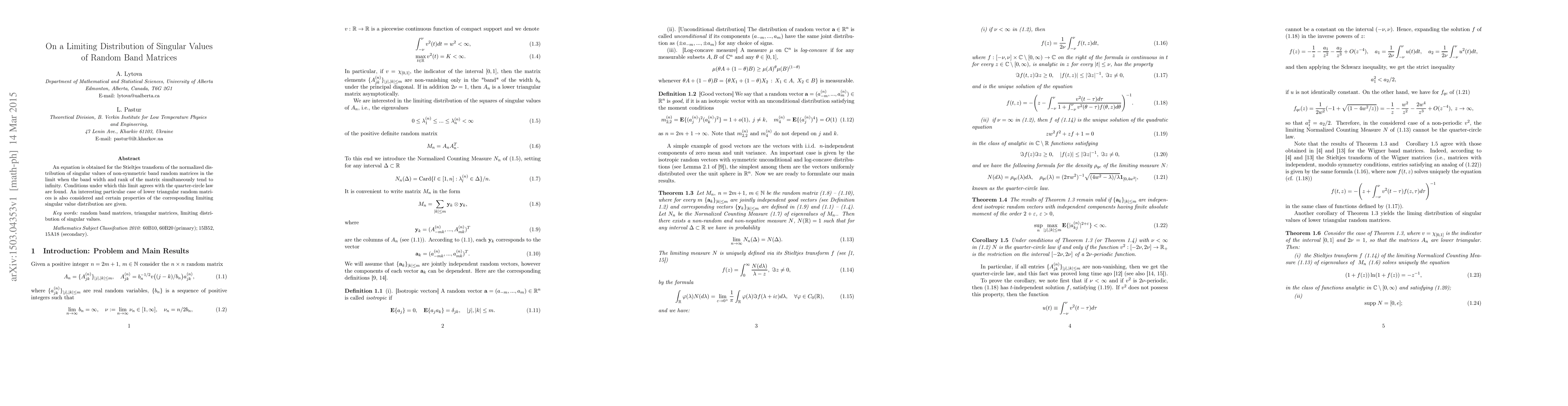 This paper derives an equation for the Stieltjes transform of the singular values of non-symmetric band random matrices as the band width and rank approach infinity, finding conditions for the limit to match the quarter-circle law, and explores properties of singular values in the specific case of lower triangular random matrices.
