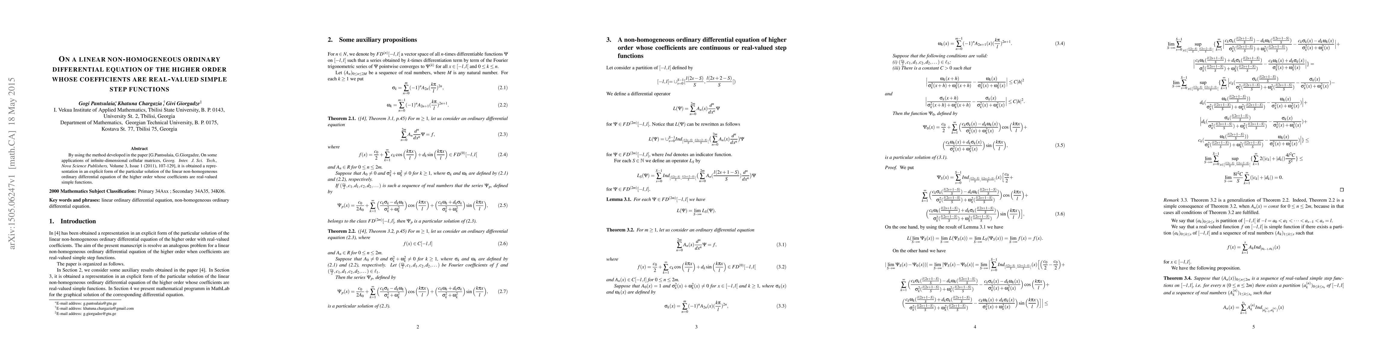 This paper derives an explicit representation for the particular solution of a higher-order linear non-homogeneous ordinary differential equation with real-valued simple step functions as coefficients, utilizing a method developed in a previous work by Pantsulaia and Giorgadze.