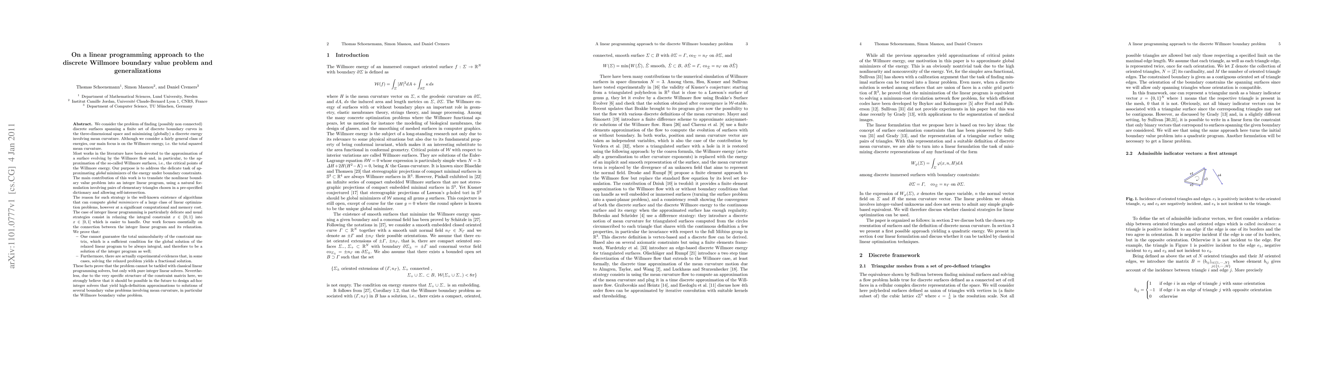 We consider the problem of finding (possibly non connected) discrete surfaces spanning a finite set of discrete boundary curves in the three-dimensional space and minimizing (globally) a discrete energy involving mean curvature. Although we consider a fairly general class of energies, our main focus is on the Willmore energy, i.e. the total squared mean curvature Our purpose is to address the delicate task of approximating global minimizers of the energy under boundary constraints. The main contribution of this work is to translate the nonlinear boundary value problem into an integer linear program, using a natural formulation involving pairs of elementary triangles chosen in a pre-specified dictionary and allowing self-intersection. Our work focuses essentially on the connection between the integer linear program and its relaxation. We prove that: - One cannot guarantee the total unimodularity of the constraint matrix, which is a sufficient condition for the global solution of the relaxed linear program to be always integral, and therefore to be a solution of the integer program as well; - Furthermore, there are actually experimental evidences that, in some cases, solving the relaxed problem yields a fractional solution. Due to the very specific structure of the constraint matrix here, we strongly believe that it should be possible in the future to design ad-hoc integer solvers that yield high-definition approximations to solutions of several boundary value problems involving mean curvature, in particular the Willmore boundary value problem.