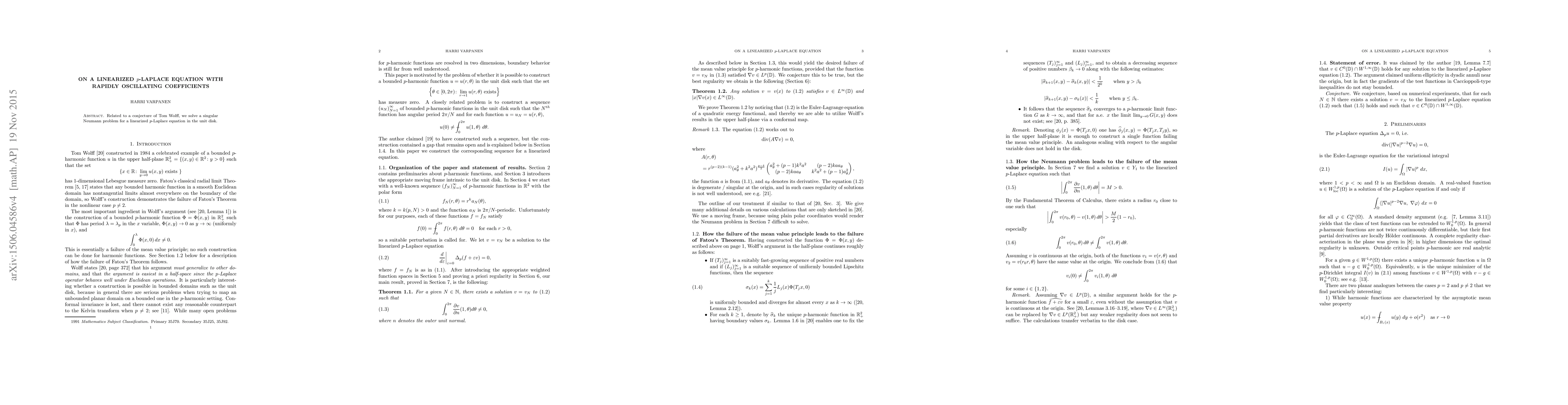 This paper solves a singular Neumann problem for a linearized p-Laplace equation in the unit disk, building on Tom Wolff's conjecture.