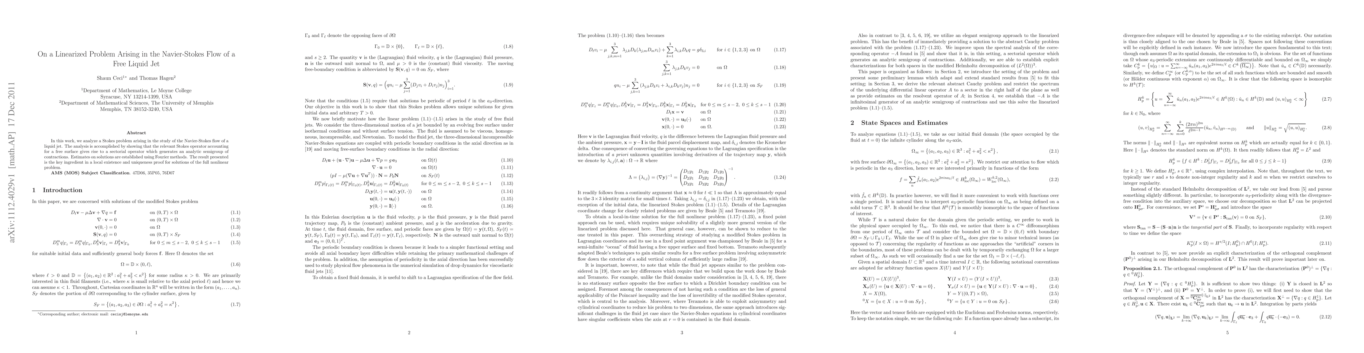 This research analyzes a Stokes problem in liquid jet flow from Navier-Stokes equations, demonstrating the Stokes operator generates an analytic semigroup of contractions. Utilizing Fourier methods, it establishes solution estimates, which are crucial for proving local existence and uniqueness of solutions for the nonlinear problem.