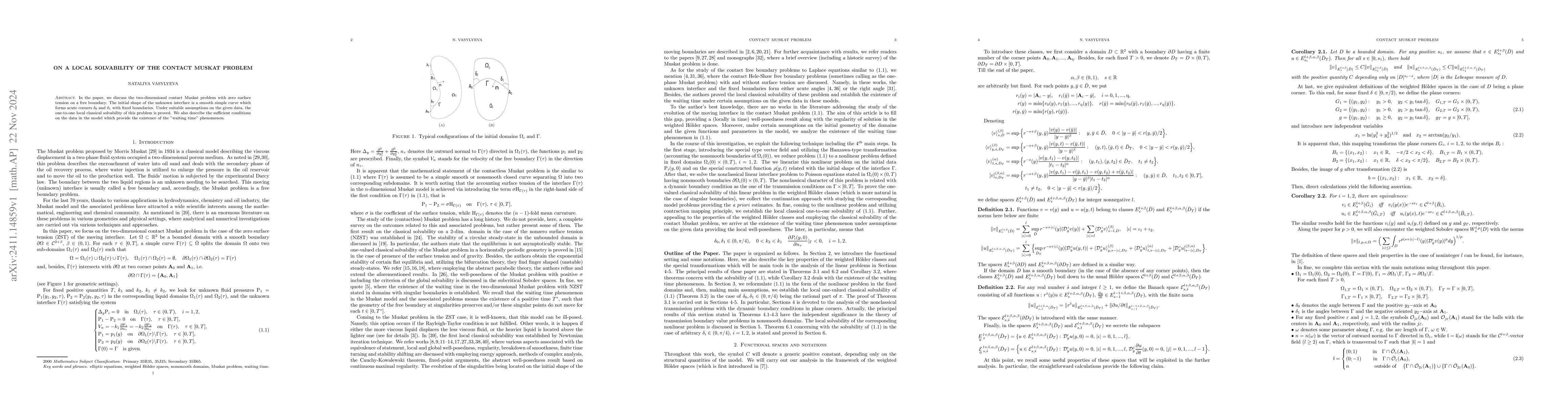 In the paper, we discuss the two-dimensional contact Muskat problem with zero surface tension of a free boundary. The initial shape of the unknown interface is a smooth simple curve which forms acute corners $\delta_{0}$ and $\delta_{1}$ with fixed boundaries. Under suitable assumptions on the given data, the one-to-one local classical solvability of this problem is proved. We also describe the sufficient conditions on the data in the model which provide the existence of the "waiting time" phenomenon.
