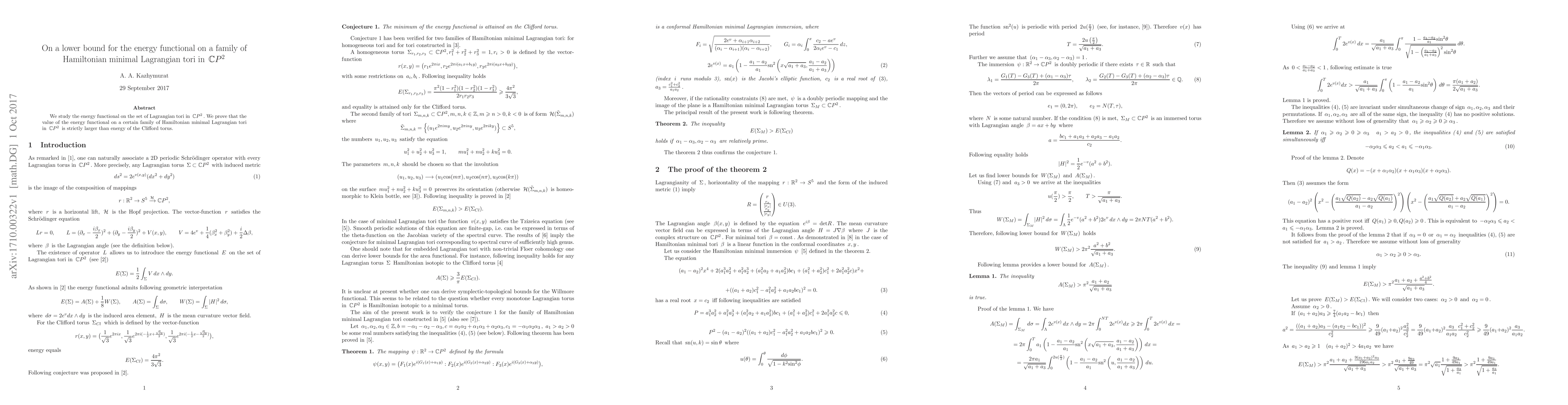 This paper establishes a lower bound for the energy functional on a specific family of Hamiltonian minimal Lagrangian tori in complex projective space $\mathbb{C}P^2$, demonstrating that their energy exceeds that of the Clifford torus.