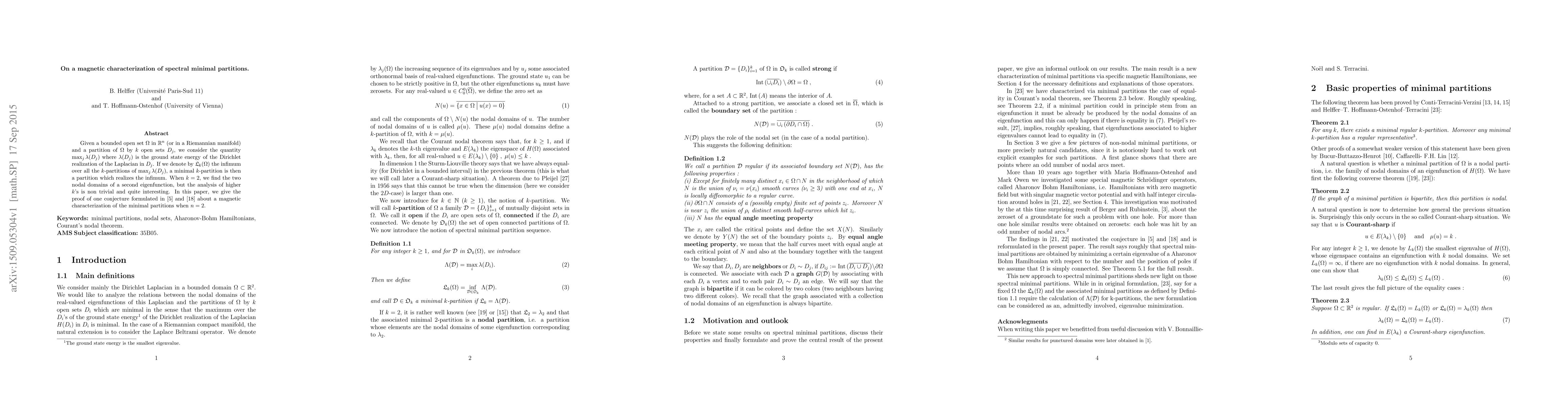 Given a bounded open set $\Omega$ in $ \mathbb R^n$ (or in a Riemannian manifold) and a partition of $\Omega$ by $k$ open sets $D_j$, we consider the quantity $\max_j \lambda(D_j)$ where $\lambda(D_j)$ is the ground state energy of the Dirichlet realization of the Laplacian in $D_j$. If we denote by $ \mathfrak L_k(\Omega)$ the infimum over all the $k$-partitions of $ \max_j \lambda(D_j)$, a minimal $k$-partition is then a partition which realizes the infimum. When $k=2$, we find the two nodal domains of a second eigenfunction, but the analysis of higher $k$'s is non trivial and quite interesting. In this paper, we give the proof of one conjecture formulated previously by V. Bonnaillie-Noel and B. Helffer about a magnetic characterization of the minimal partitions when $n=2$.