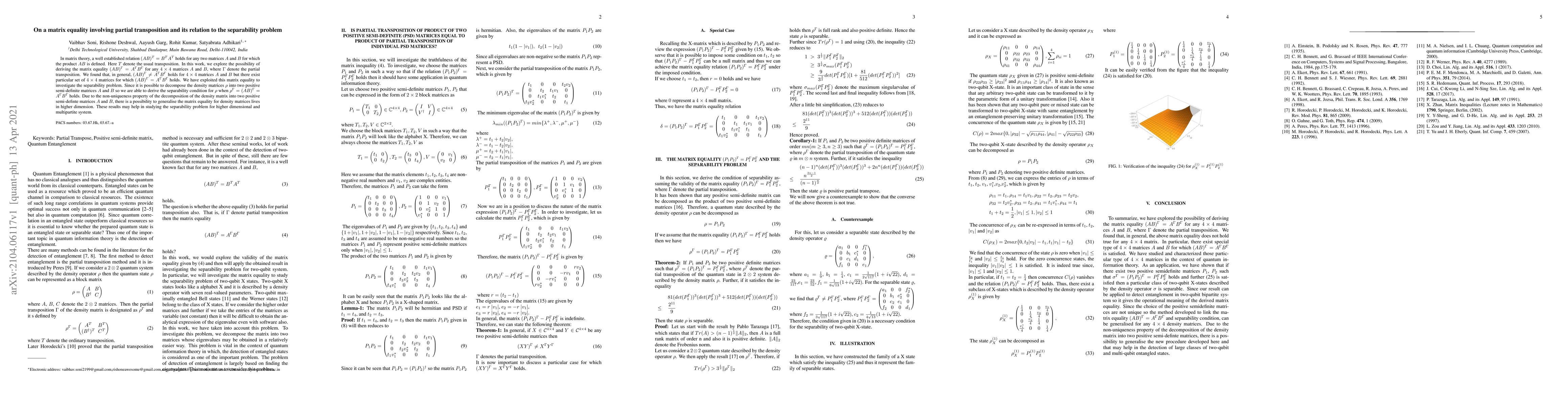 Researchers explored a matrix equality involving partial transposition and its relation to the separability problem in quantum mechanics, finding that it holds for certain matrices but not others, with implications for studying higher-dimensional systems.