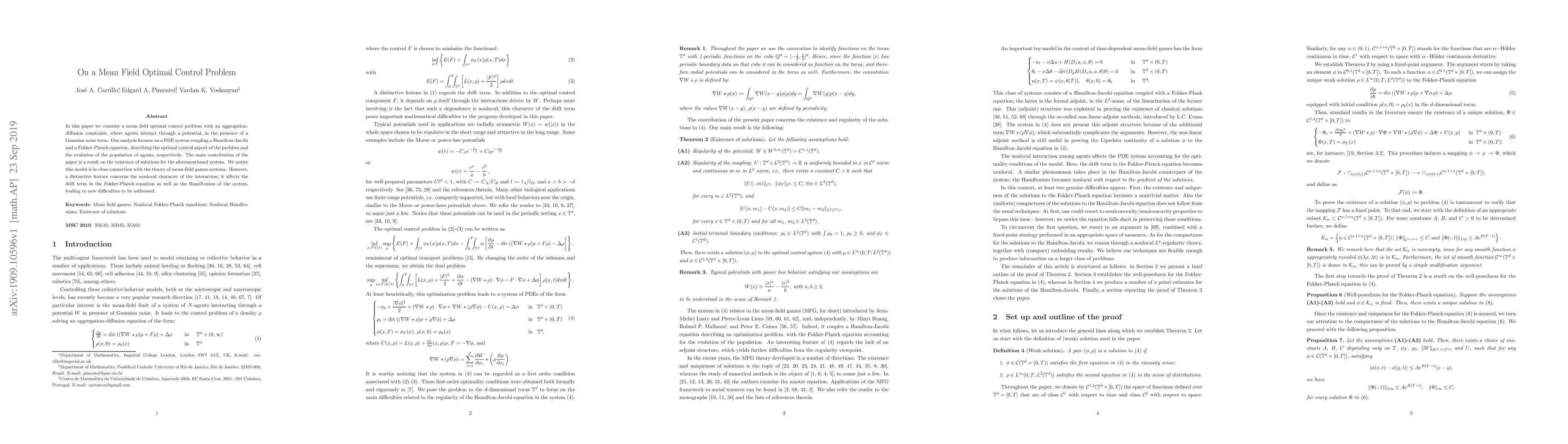 In this paper we consider a mean field optimal control problem with an aggregation-diffusion constraint, where agents interact through a potential, in the presence of a Gaussian noise term. Our analysis focuses on a PDE system coupling a Hamilton-Jacobi and a Fokker-Planck equation, describing the optimal control aspect of the problem and the evolution of the population of agents, respectively. The main contribution of the paper is a result on the existence of solutions for the aforementioned system. We notice this model is in close connection with the theory of mean-field games systems. However, a distinctive feature concerns the nonlocal character of the interaction; it affects the drift term in the Fokker-Planck equation as well as the Hamiltonian of the system, leading to new difficulties to be addressed.