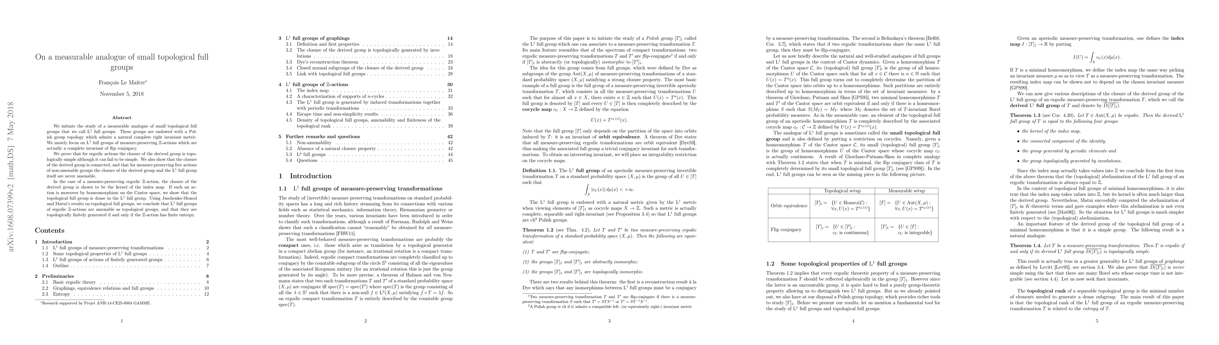 We initiate the study of a measurable analogue of small topological full groups that we call $\mathrm L^1$ full groups. These groups are endowed with a Polish group topology which admits a natural complete right invariant metric. We mostly focus on $\mathrm L^1$ full groups of measure-preserving $\mathbb Z$-actions which are actually a complete invariant of flip conjugacy. We prove that for ergodic actions the closure of the derived group is topologically simple although it can fail to be simple. We also show that the closure of the derived group is connected, and that for measure-preserving free actions of non-amenable groups the closure of the derived group and the $\mathrm L^1$ full group itself are never amenable. In the case of a measure-preserving ergodic $\mathbb Z$-action, the closure of the derived group is shown to be the kernel of the index map. If such an action is moreover by homeomorphism on the Cantor space, we show that the topological full group is dense in the $\mathrm L^1$ full group. Using Juschenko-Monod and Matui's results on topological full groups, we conclude that $\mathrm L^1$ full groups of ergodic $\mathbb Z$-actions are amenable as topological groups, and that they are topologically finitely generated if and only if the $\mathbb Z$-action has finite entropy.