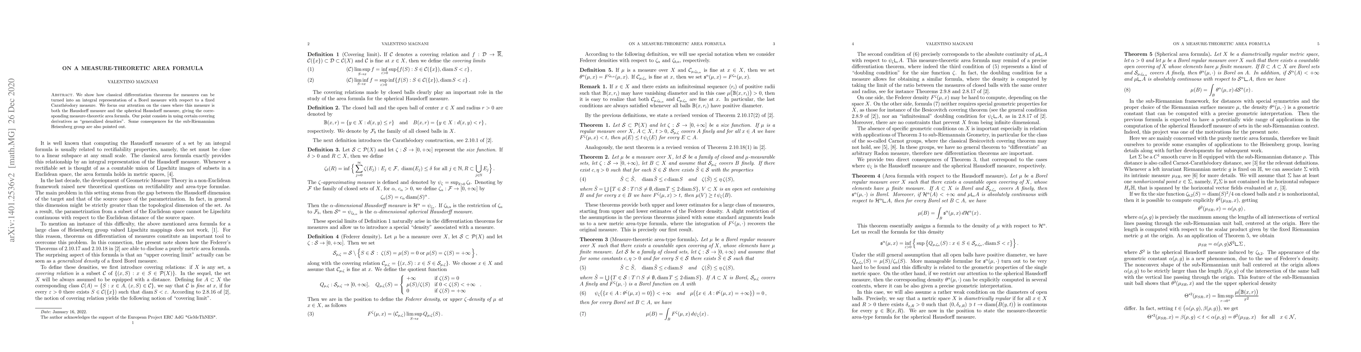 This paper develops an integral representation of Borel measures relative to Carathéodory measures, specifically for Hausdorff and spherical Hausdorff measures, leading to a measure-theoretic area formula. It employs covering derivatives as generalized densities and discusses implications for the sub-Riemannian Heisenberg group.
