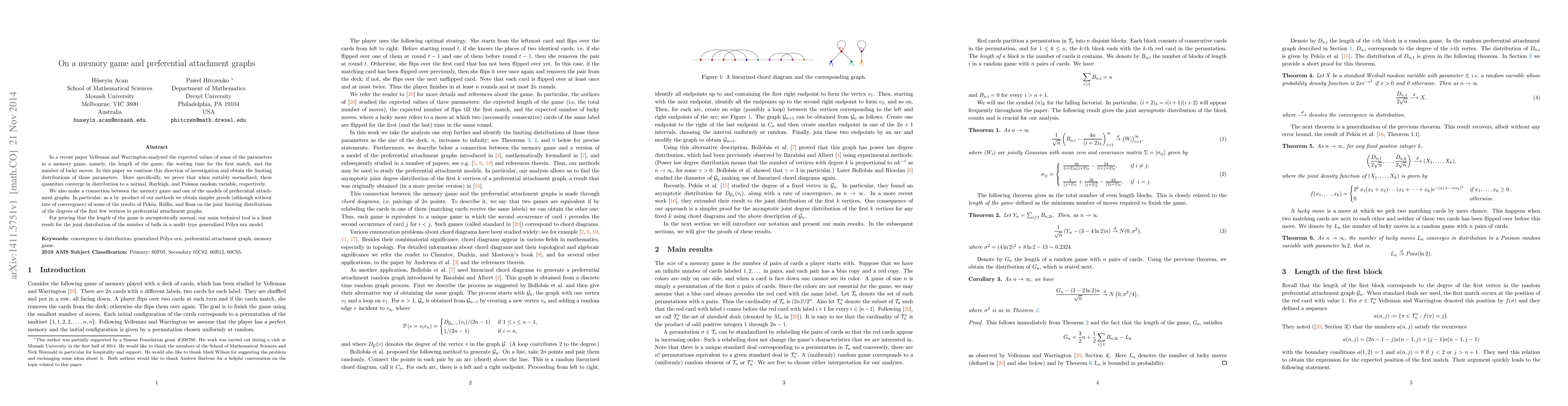 A research paper investigates the limiting distributions of parameters in a memory game, including convergence to normal, Rayleigh, and Poisson random variables. It also establishes connections with preferential attachment graphs and provides simpler proofs for some results.