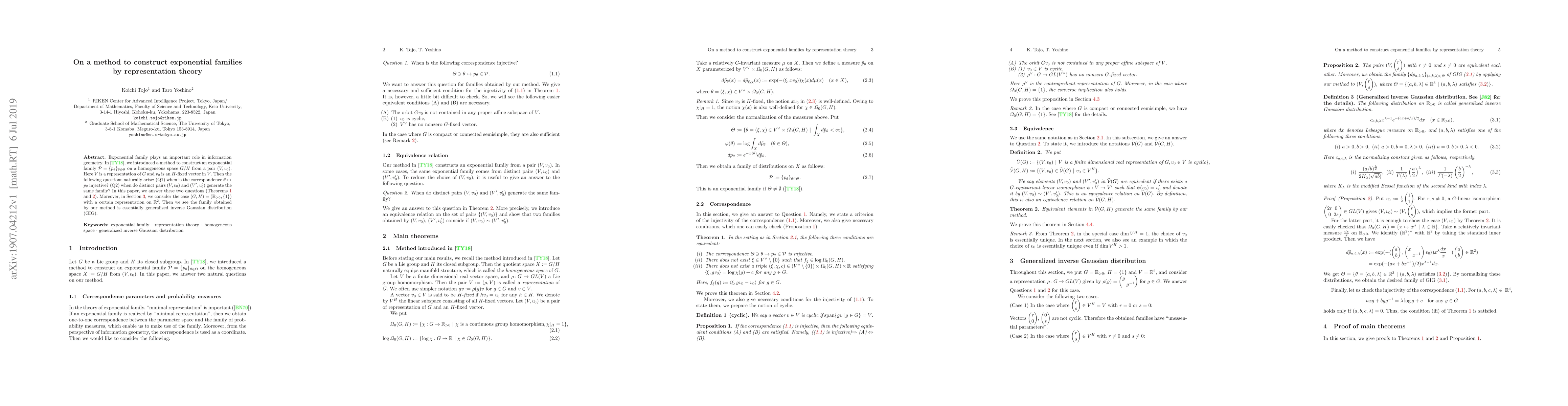 Exponential family plays an important role in information geometry. In arXiv:1811.01394, we introduced a method to construct an exponential family $\mathcal{P}=\{p_\theta\}_{\theta\in\Theta}$ on a homogeneous space $G/H$ from a pair $(V,v_0)$. Here $V$ is a representation of $G$ and $v_0$ is an $H$-fixed vector in $V$. Then the following questions naturally arise: (Q1) when is the correspondence $\theta\mapsto p_\theta$ injective? (Q2) when do distinct pairs $(V,v_0)$ and $(V',v_0')$ generate the same family? In this paper, we answer these two questions (Theorems 1 and 2). Moreover, in Section 3, we consider the case $(G,H)=(\mathbb{R}_{>0}, \{1\})$ with a certain representation on $\mathbb{R}^2$. Then we see the family obtained by our method is essentially generalized inverse Gaussian distribution (GIG).