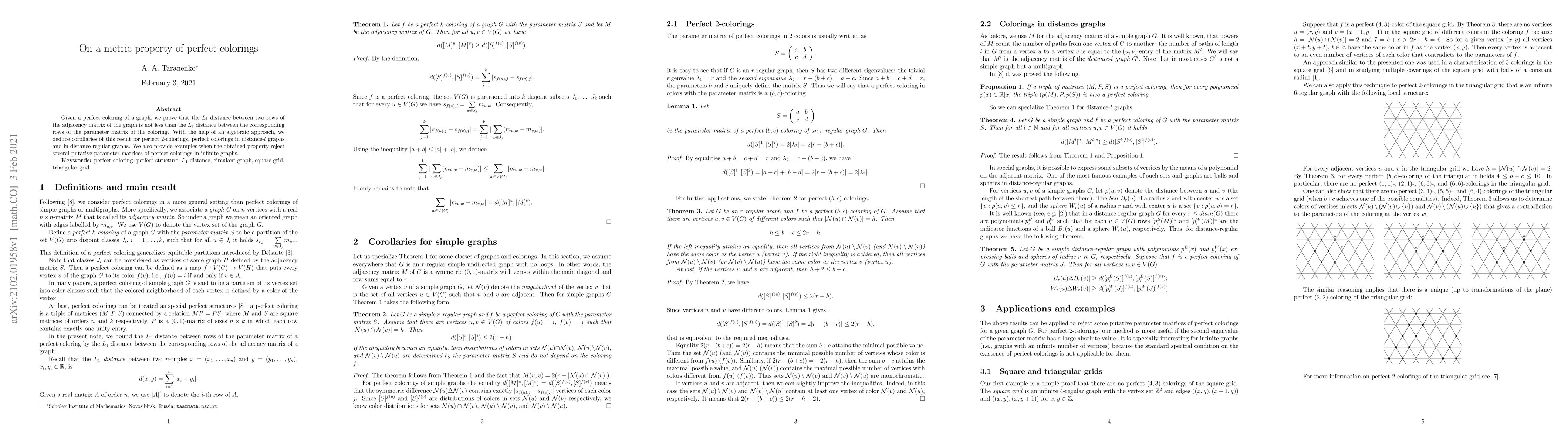 This paper proves that the $L_1$ distance between rows in the adjacency matrix of a graph is greater than or equal to the corresponding distance in the parameter matrix of its perfect coloring. It also explores implications for perfect $2$-colorings, distance-$l$ graphs, and distance-regular graphs, and refutes several proposed parameter matrices for infinite graphs.