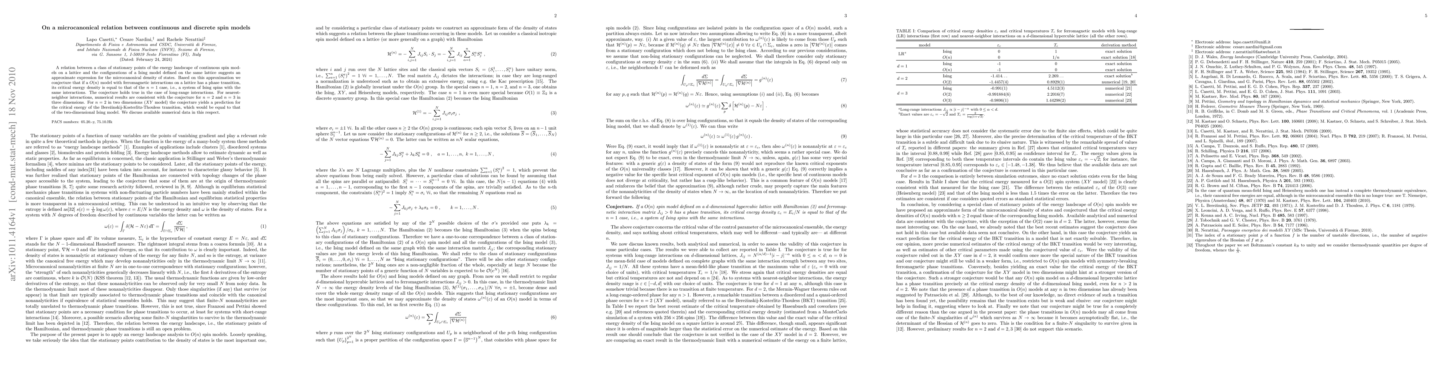A relation between a class of stationary points of the energy landscape of continuous spin models on a lattice and the configurations of a Ising model defined on the same lattice suggests an approximate expression for the microcanonical density of states. Based on this approximation we conjecture that if a O(n) model with ferromagnetic interactions on a lattice has a phase transition, its critical energy density is equal to that of the n = 1 case, i.e., a system of Ising spins with the same interactions. The conjecture holds true in the case of long-range interactions. For nearest-neighbor interactions, numerical results are consistent with the conjecture for n=2 and n=3 in three dimensions. For n=2 in two dimensions (XY model) the conjecture yields a prediction for the critical energy of the Berezinskij-Kosterlitz-Thouless transition, which would be equal to that of the two-dimensional Ising model. We discuss available numerical data in this respect.