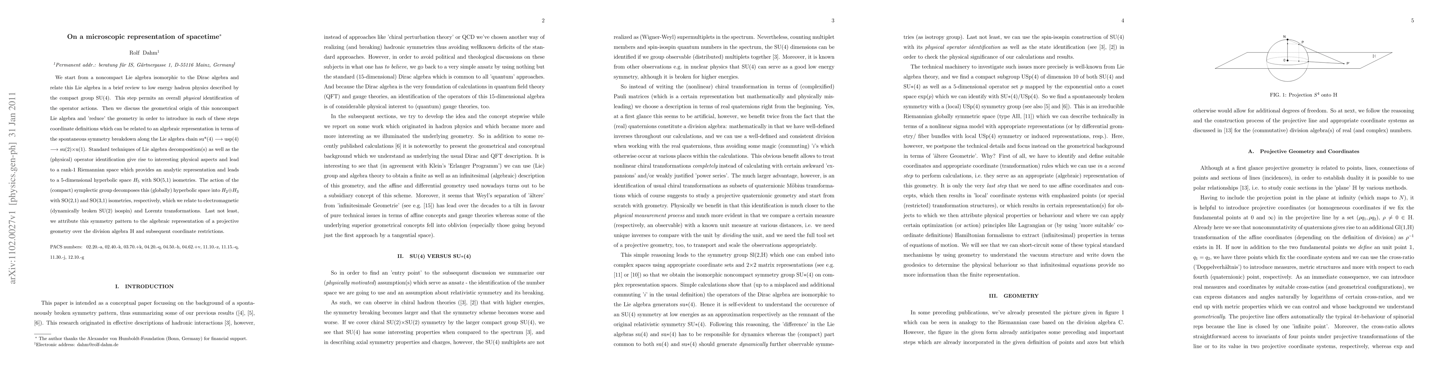 We start from a noncompact Lie algebra isomorphic to the Dirac algebra and relate this Lie algebra in a brief review to low energy hadron physics described by the compact group SU(4). This step permits an overall physical identification of the operator actions. Then we discuss the geometrical origin of this noncompact Lie algebra and 'reduce' the geometry in order to introduce in each of these steps coordinate definitions which can be related to an algebraic representation in terms of the spontaneous symmetry breakdown along the Lie algebra chain su*(4) $\longrightarrow$ usp(4) $\longrightarrow$ su(2)$\times$u(1). Standard techniques of Lie algebra decomposition(s) as well as the (physical) operator identification give rise to interesting physical aspects and lead to a rank-1 Riemannian space which provides an analytic representation and leads to a 5-dimensional hyperbolic space $H_{5}$ with SO(5,1) isometries. The action of the (compact) symplectic group decomposes this (globally) hyperbolic space into $H_{2}\oplus H_{3}$ with SO(2,1) and SO(3,1) isometries, respectively, which we relate to electromagnetic (dynamically broken SU(2) isospin) and Lorentz transformations. Last not least, we attribute this symmetry pattern to the algebraic representation of a projective geometry over the division algebra $H$ and subsequent coordinate restrictions.