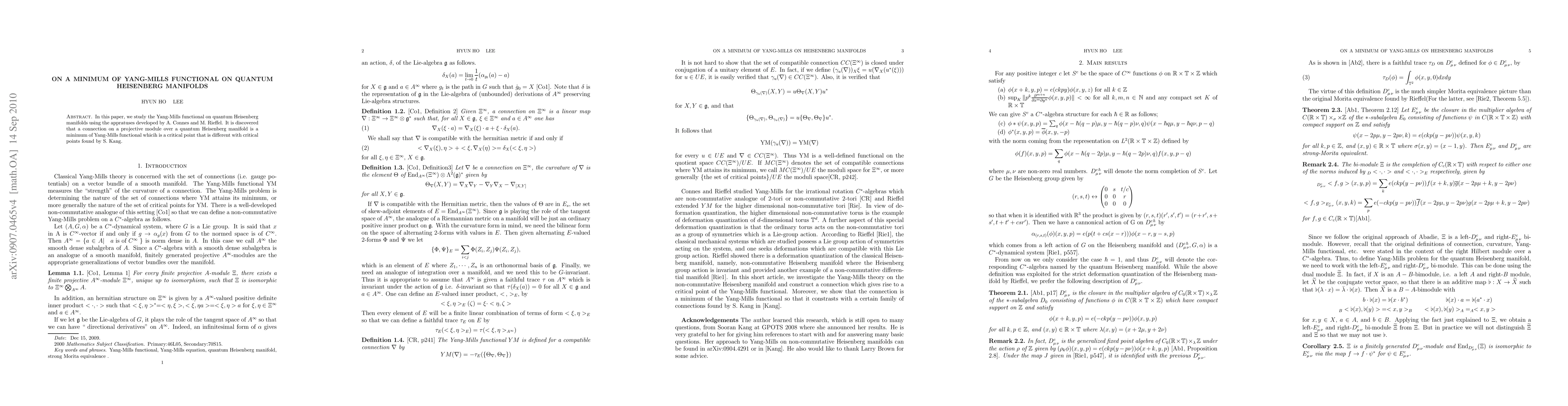 This paper investigates the Yang-Mills functional on quantum Heisenberg manifolds, employing tools from Connes and Rieffel. It reveals that a connection on a projective module over these manifolds minimizes the Yang-Mills functional, identifying a distinct critical point from those previously found by S. Kang.