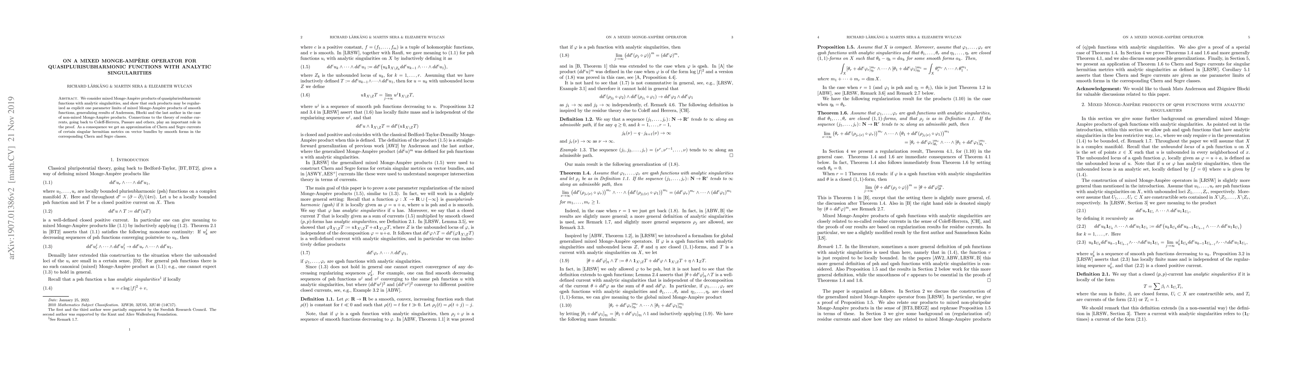 This paper regularizes mixed Monge-Ampère products of quasiplurisubharmonic functions with analytic singularities as limits of smooth functions, extending previous results. The proof leverages connections to residue currents theory, leading to approximations of Chern and Segre currents for singular hermitian metrics on vector bundles.