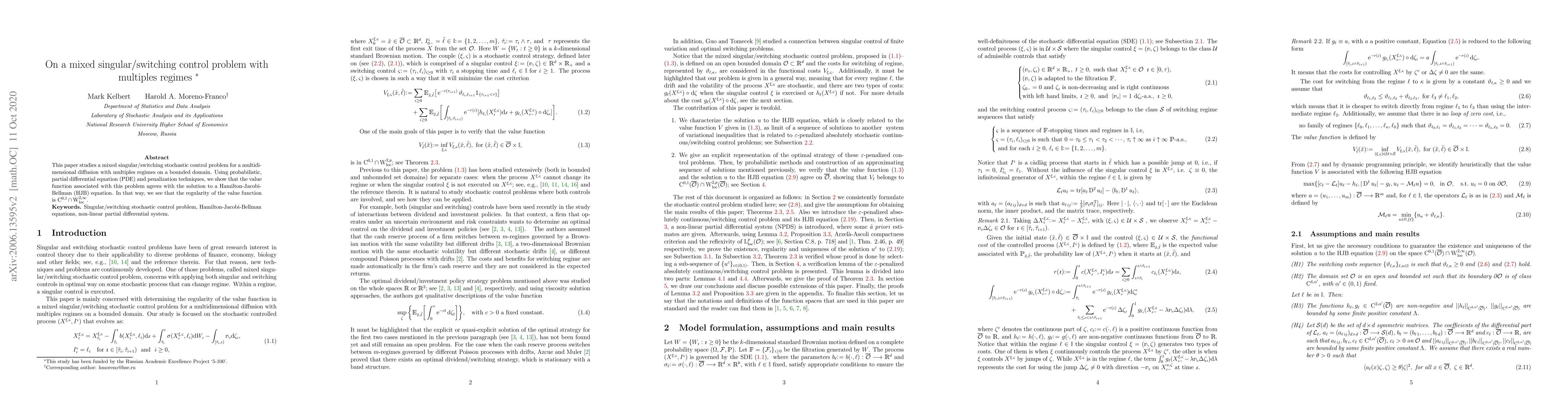 This paper studies a mixed singular/switching control problem with multiple regimes on a bounded domain, showing that the value function agrees with the solution to an HJB equation, leading to regularity of $C^{0,1}igcapigW^{2,ty}_{loc}$.