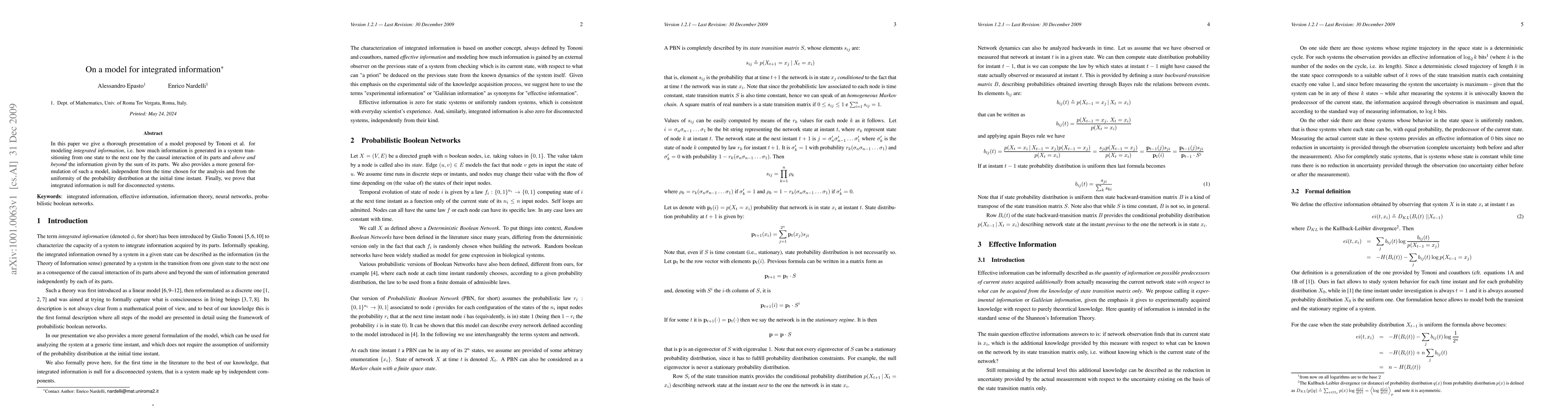 In this paper we give a thorough presentation of a model proposed by Tononi et al. for modeling \emph{integrated information}, i.e. how much information is generated in a system transitioning from one state to the next one by the causal interaction of its parts and \emph{above and beyond} the information given by the sum of its parts. We also provides a more general formulation of such a model, independent from the time chosen for the analysis and from the uniformity of the probability distribution at the initial time instant. Finally, we prove that integrated information is null for disconnected systems.
