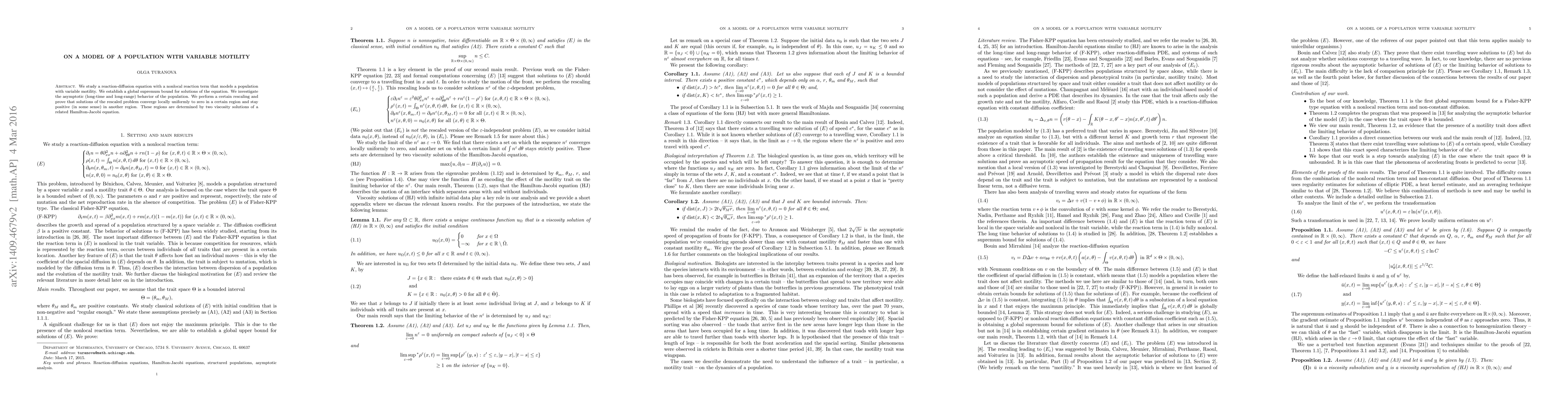 We study a reaction-diffusion equation with a nonlocal reaction term that models a population with variable motility. We establish a global supremum bound for solutions of the equation. We investigate the asymptotic (long-time and long-range) behavior of the population. We perform a certain rescaling and prove that solutions of the rescaled problem converge locally uniformly to zero in a certain region and stay positive (in some sense) in another region. These regions are determined by two viscosity solutions of a related Hamilton-Jacobi equation.