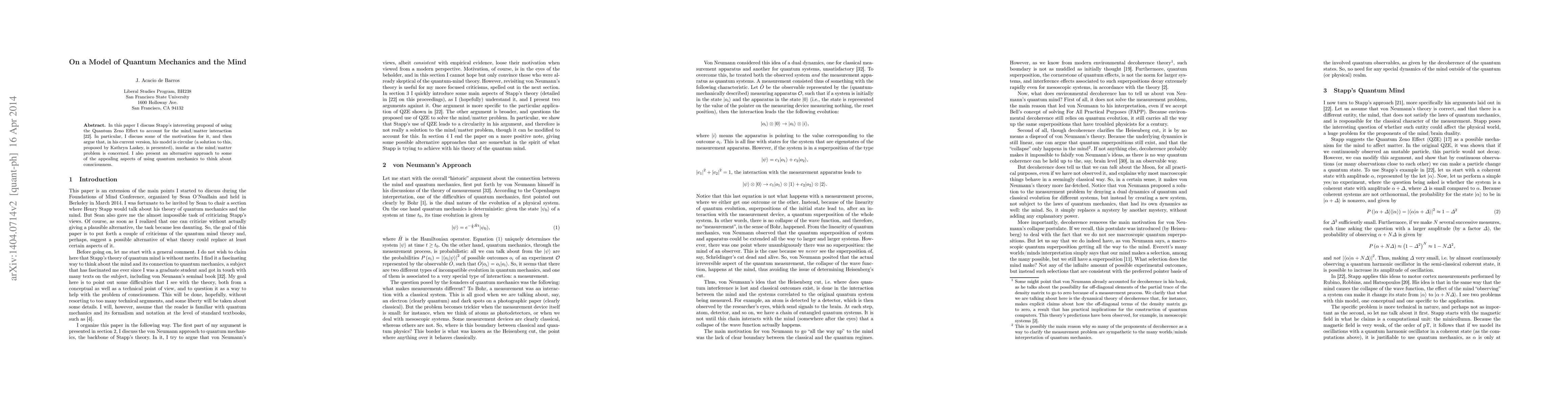 In this paper I discuss Stapp's (2014) interesting proposal of using the Quantum Zeno Effect to account for the mind/matter interaction. In particular, I discuss some of the motivations for it, and then argue that, in his current version, his model is circular (a solution to this, proposed by Kathryn Laskey, is presented), insofar as the mind/matter problem is concerned. I also present an alternative approach to some of the appealing aspects of using quantum mechanics to think about consciousness.