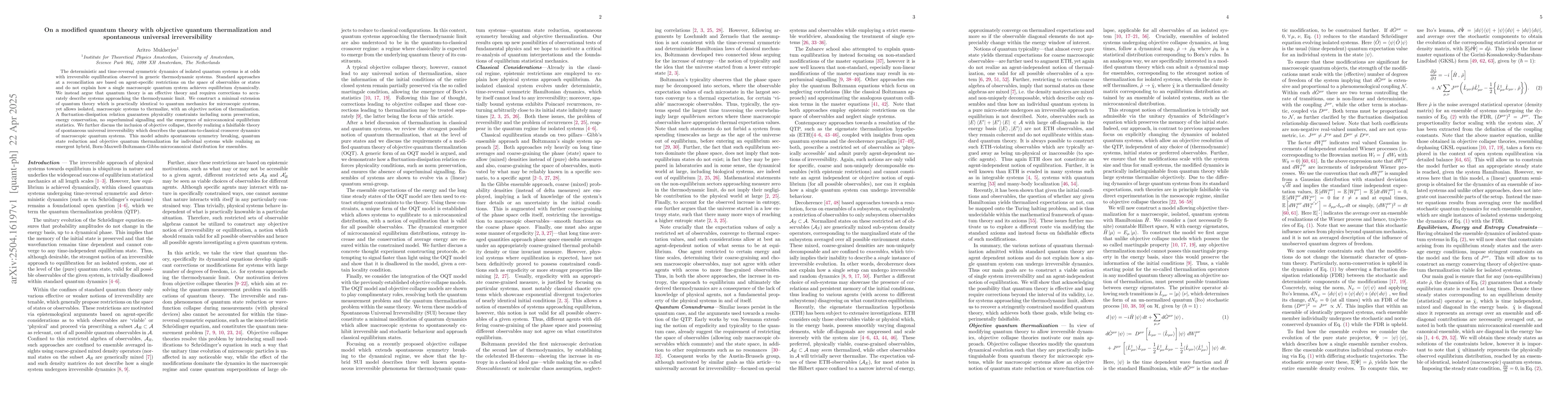 A new theory modifies quantum mechanics to explain how isolated macroscopic systems achieve thermal equilibrium without violating time-reversal symmetry, introducing a concept of objective quantum thermalization and spontaneous universal irreversibility.