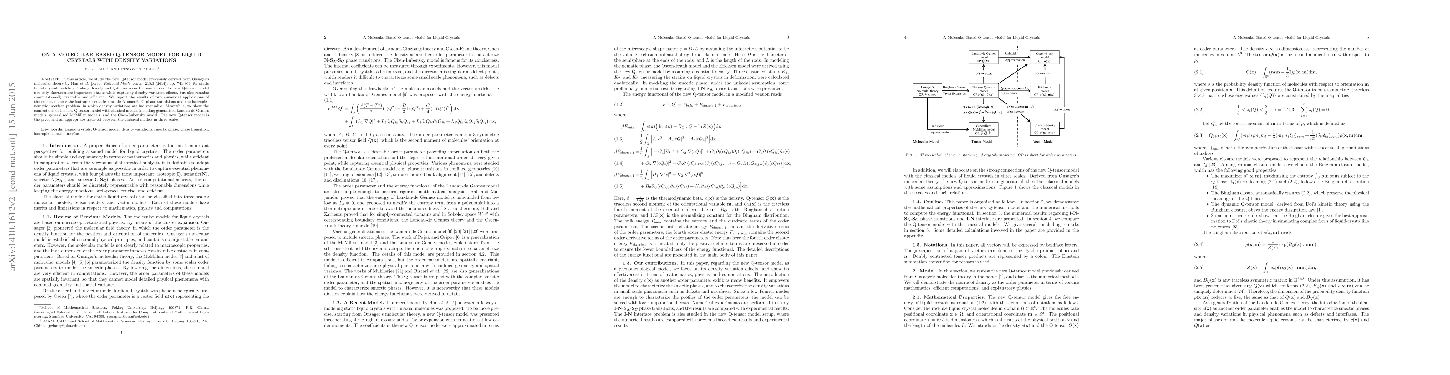 In this article, we study the new Q-tensor model previously derived from Onsager's molecular theory by Han \textit{et al.} [Arch. Rational Mech. Anal., 215.3 (2014), pp. 741-809] for static liquid crystal modeling. Taking density and Q-tensor as order parameters, the new Q-tensor model not only characterizes important phases while capturing density variation effects, but also remains computationally tractable and efficient. We report the results of two numerical applications of the model, namely the isotropic--nematic--smectic-A--smectic-C phase transitions and the isotropic--nematic interface problem, in which density variations are indispensable. Meanwhile, we show the connections of the new Q-tensor model with classical models including generalized Landau-de Gennes models, generalized McMillan models, and the Chen-Lubensky model. The new Q-tensor model is the pivot and an appropriate trade-off between the classical models in three scales.