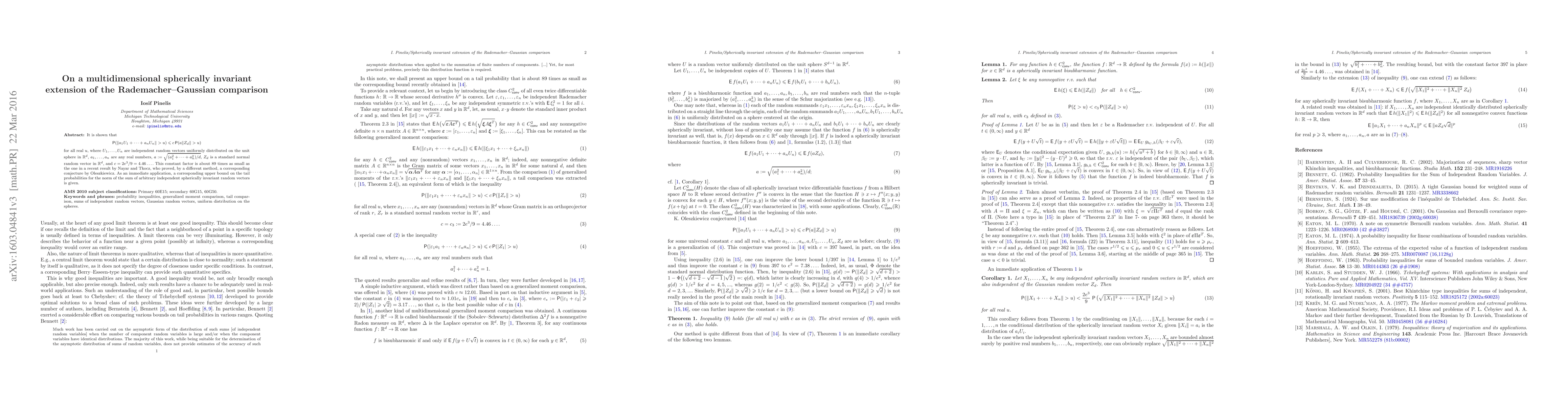 It is shown that \begin{equation*} \mathsf{P}(\|a_1U_1+\dots+a_nU_n\|>u)\le c\,\mathsf{P}(a\|Z_d\|>u) \end{equation*} for all real $u$, where $U_1,\dots,U_n$ are independent random vectors uniformly distributed on the unit sphere in $\mathbb{R}^d$, $a_1,\dots,a_n$ are any real numbers, $a:=\sqrt{(a_1^2+\dots+a_n^2)/d}$, $Z_d$ is a standard normal random vector in $\mathbb{R}^d$, and $c=2e^3/9=4.46\dots$. This constant factor is about $89$ times as small as the one in a recent result by Nayar and Tkocz, who proved, by a different method, a corresponding conjecture by Oleszkiewicz. As an immediate application, a corresponding upper bound on the tail probabilities for the norm of the sum of arbitrary independent spherically invariant random vectors is given.