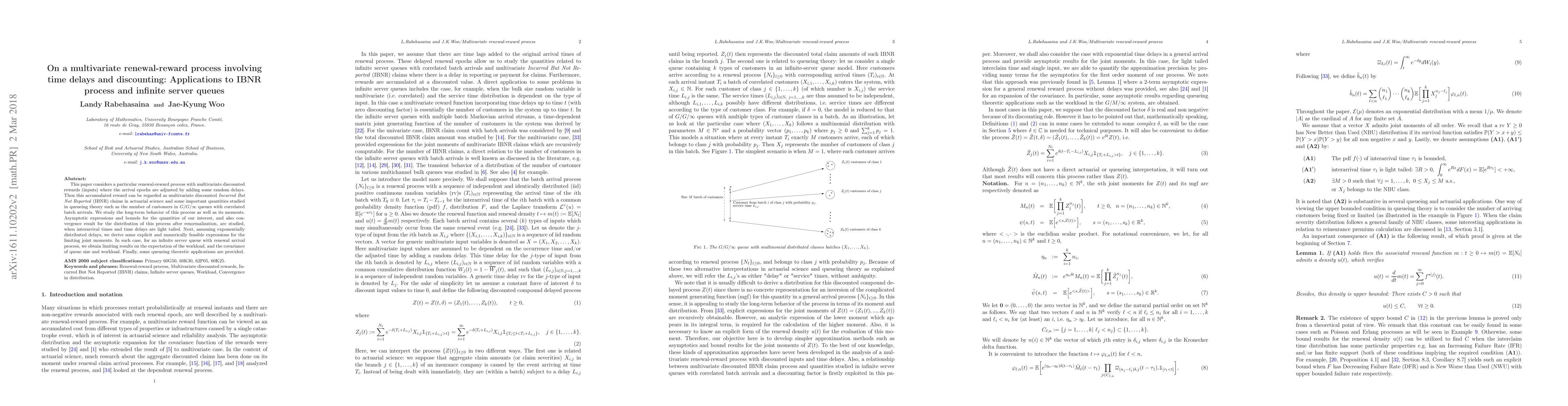 This paper considers a particular renewal-reward process with multivariate discounted rewards (inputs) where the arrival epochs are adjusted by adding some random delays. Then this accumulated reward can be regarded as multivariate discounted Incurred But Not Reported (IBNR) claims in actuarial science and some important quantities studied in queueing theory such as the number of customers in G/G/infinity queues with correlated batch arrivals. We study the long term behavior of this process as well as its moments. Asymptotic expressions and bounds for the quantities of our interest, and also convergence result for the distribution of this process after renormalization, are studied, when interarrival times and time delays are light tailed. Next, assuming exponentially distributed delays, we derive some explicit and numerically feasible expressions for the limiting joint moments. In such case, for an innite server queues with renewal arrival process, we obtain limiting results on the expectation of the workload, and the covariance of queue size and workload. Finally, some queueing theoretic applications are providedMSC classification: 60G50, 60K30, 62P05, 60K25