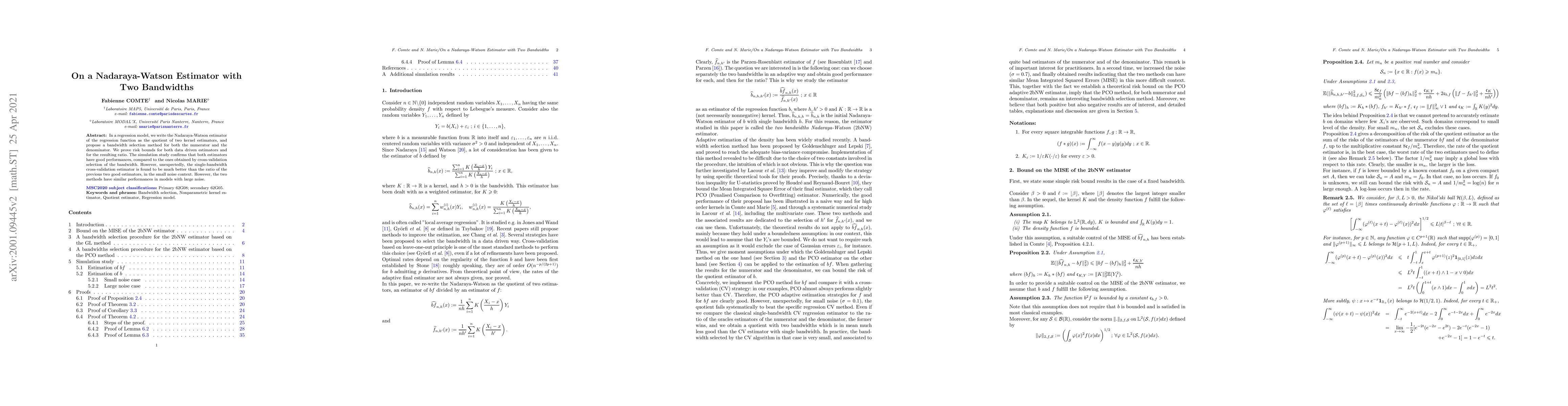 In a regression model, we write the Nadaraya-Watson estimator of the regression function as the quotient of two kernel estimators, and propose a bandwidth selection method for both the numerator and the denominator. We prove risk bounds for both data driven estimators and for the resulting ratio. The simulation study confirms that both estimators have good performances, compared to the ones obtained by cross-validation selection of the bandwidth. However, unexpectedly, the single-bandwidth cross-validation estimator is found to be much better than the ratio of the previous two good estimators, in the small noise context. However, the two methods have similar performances in models with large noise.