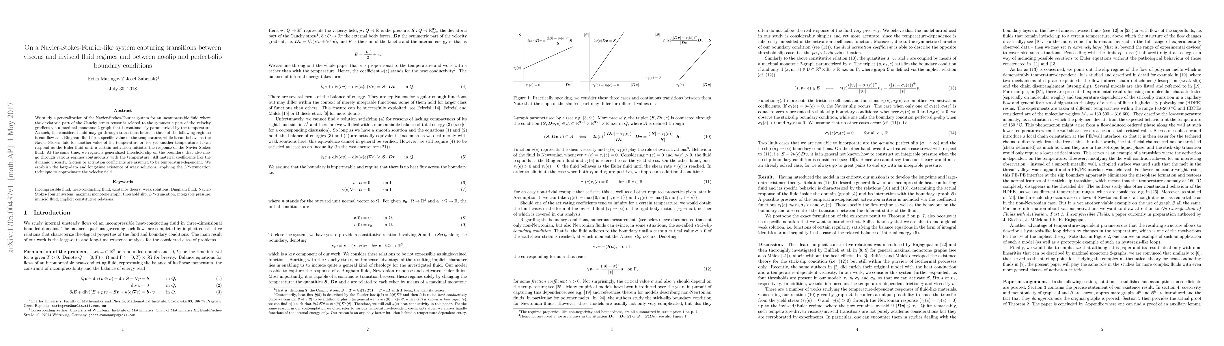 This research paper develops a Navier-Stokes-Fourier system that captures transitions between different fluid regimes, including Bingham, Navier-Stokes, and Euler fluids, as well as varying boundary conditions, all of which depend on temperature.