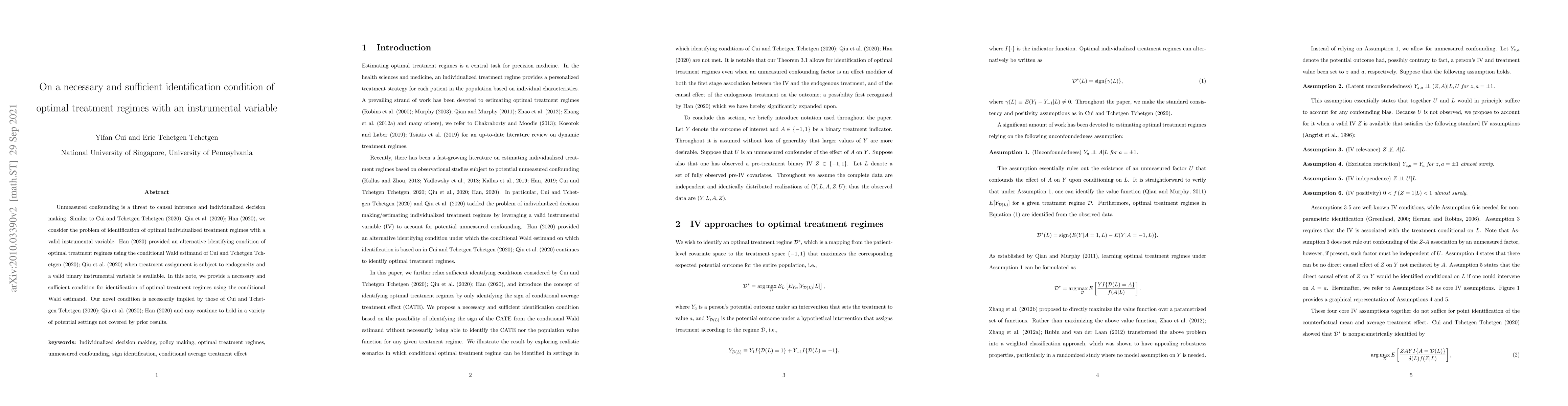 Unmeasured confounding is a threat to causal inference and individualized decision making. Similar to Cui and Tchetgen Tchetgen (2020); Qiu et al. (2020); Han (2020a), we consider the problem of identification of optimal individualized treatment regimes with a valid instrumental variable. Han (2020a) provided an alternative identifying condition of optimal treatment regimes using the conditional Wald estimand of Cui and Tchetgen Tchetgen (2020); Qiu et al. (2020) when treatment assignment is subject to endogeneity and a valid binary instrumental variable is available. In this note, we provide a necessary and sufficient condition for identification of optimal treatment regimes using the conditional Wald estimand. Our novel condition is necessarily implied by those of Cui and Tchetgen Tchetgen (2020); Qiu et al. (2020); Han (2020a) and may continue to hold in a variety of potential settings not covered by prior results.
