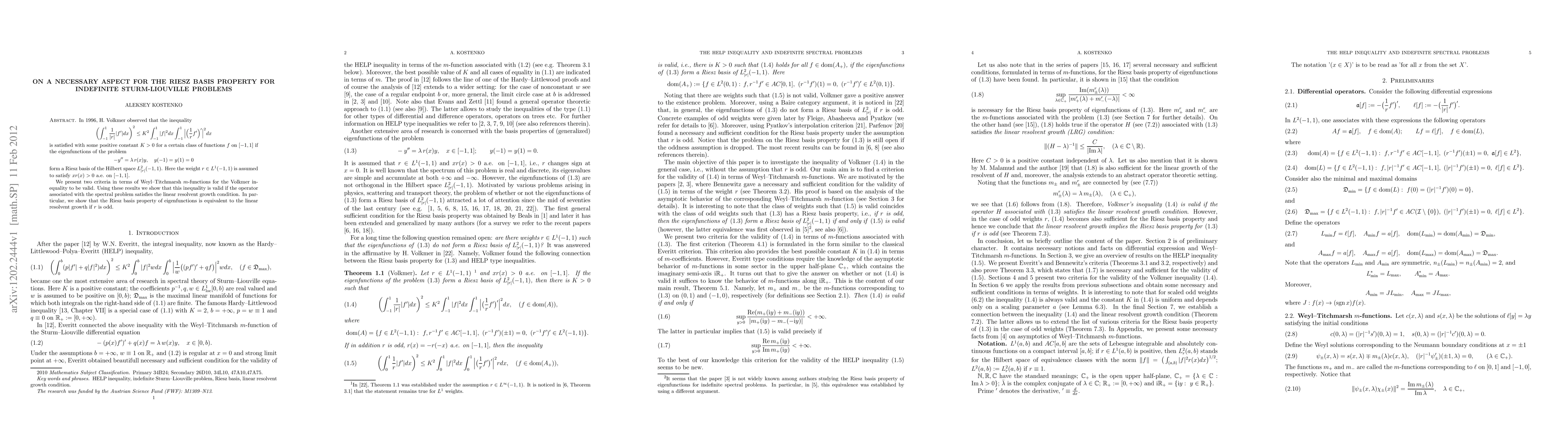 In 1996, H. Volkmer observed that the inequality \[(\int_{-1}^1\frac{1}{|r|}|f'|dx)^2 \le K^2 \int_{-1}^1|f|^2dx\int_{-1}^1\Big|\Big(\frac{1}{r}f'\Big)'\Big|^2dx \] is satisfied with some positive constant $K>0$ for a certain class of functions $f$ on $[-1,1]$ if the eigenfunctions of the problem \[ -y"=\lambda\, r(x)y,\quad y(-1)=y(1)=0 \] form a Riesz basis of the Hilbert space $L^2_{|r|}(-1,1)$. Here the weight $r\in L^1(-1,1)$ is assumed to satisfy $xr(x)>0$ a.e. on $[-1,1]$. We present two criteria in terms of Weyl-Titchmarsh $m$-functions for the Volkmer inequality to be valid. Using these results we show that this inequality is valid if the operator associated with the spectral problem satisfies the linear resolvent growth condition. In particular, we show that the Riesz basis property of eigenfunctions is equivalent to the linear resolvent growth if $r$ is odd.