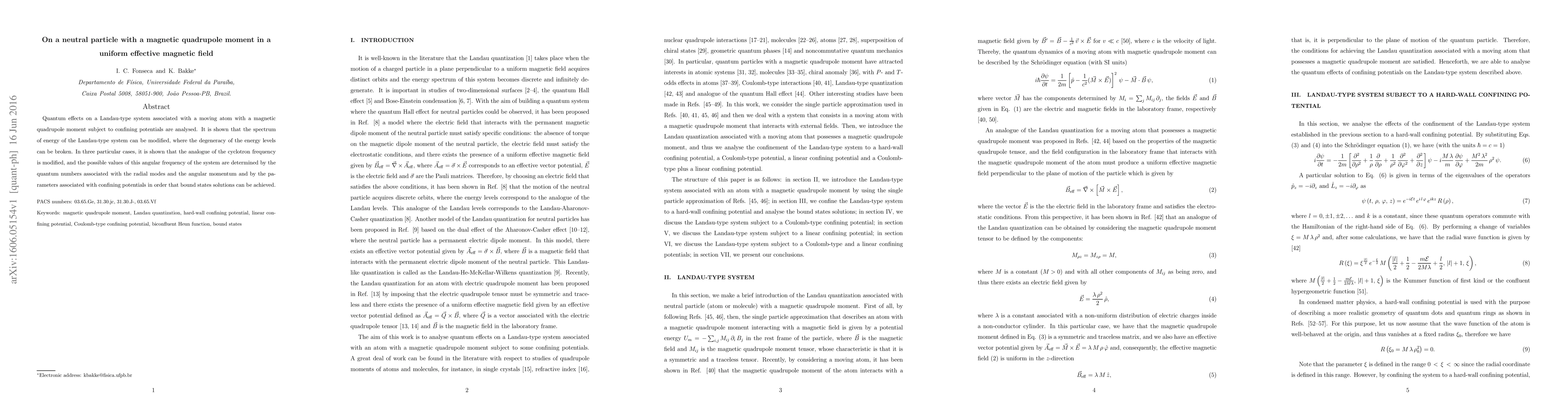 This paper analyzes quantum effects on a Landau-type system involving a moving atom with a magnetic quadrupole moment under confining potentials, showing that the energy spectrum and cyclotron frequency can be modified, with bound states determined by quantum numbers and potential parameters.