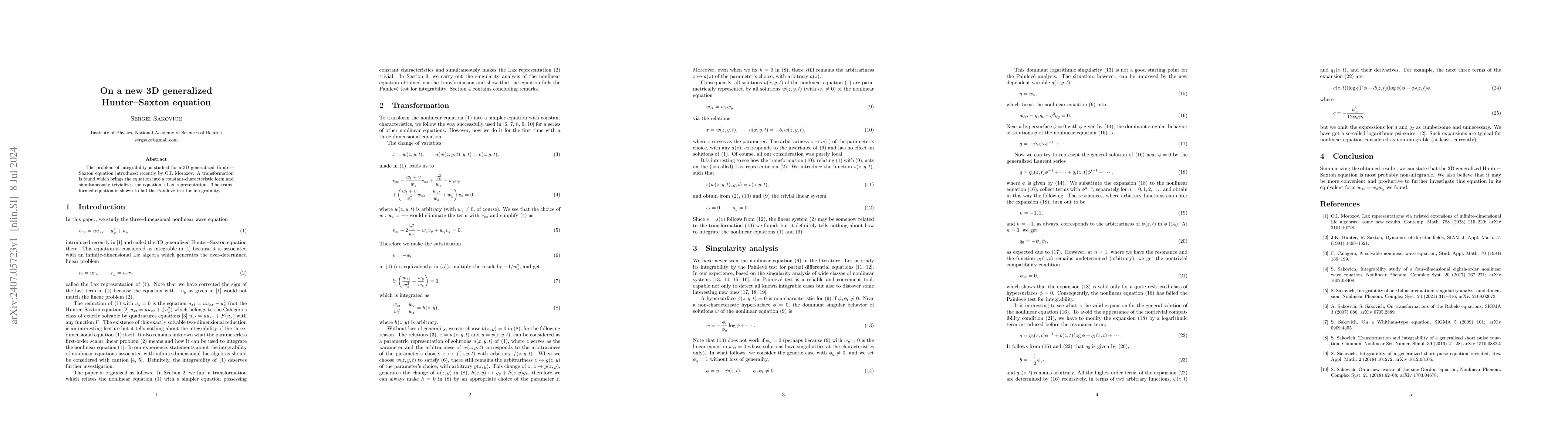 The paper explores the integrability of a newly proposed 3D generalized Hunter-Saxton equation by Morozov, revealing a transformation that simplifies its Lax representation but demonstrating the equation fails the Painlevé test for integrability.